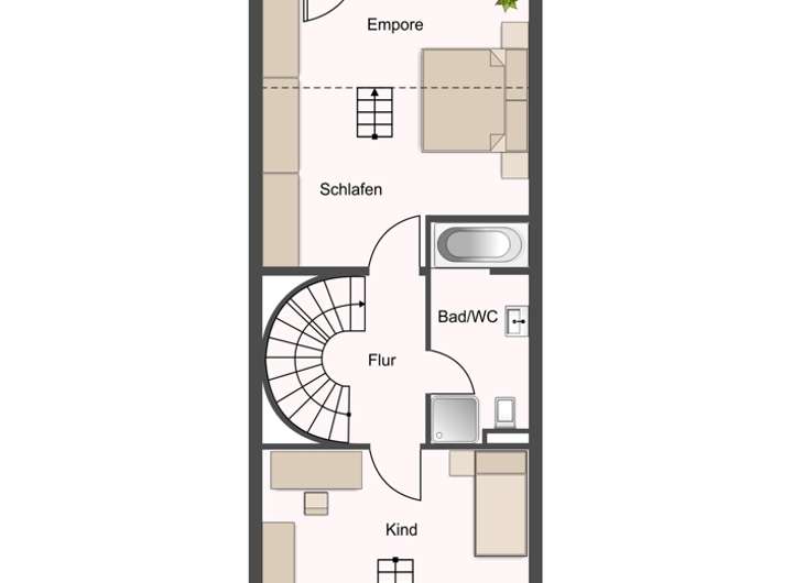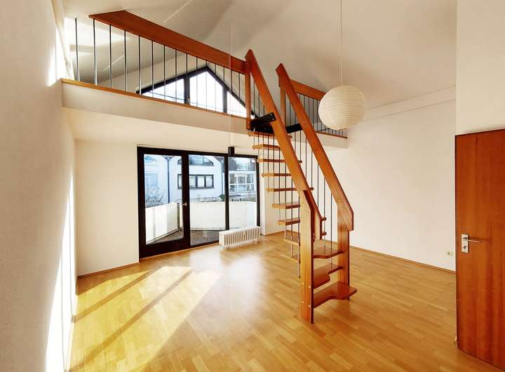 Über eine Wendeltreppe gelangen Sie ins Obergeschoss. Dort befinden sich zwei gut geschnittene Schlafzimmer, die jeweils über eine praktische Empore verfügen – perfekt als Arbeitsplatz, Leseecke oder zusätzliche Staufläche. Eines der Schlafzimmer bietet zudem Zugang zu einem rückseitig gelegenen Balkon. Das innenliegende Badezimmer ist mit Badewanne und separater Dusche ausgestattet.