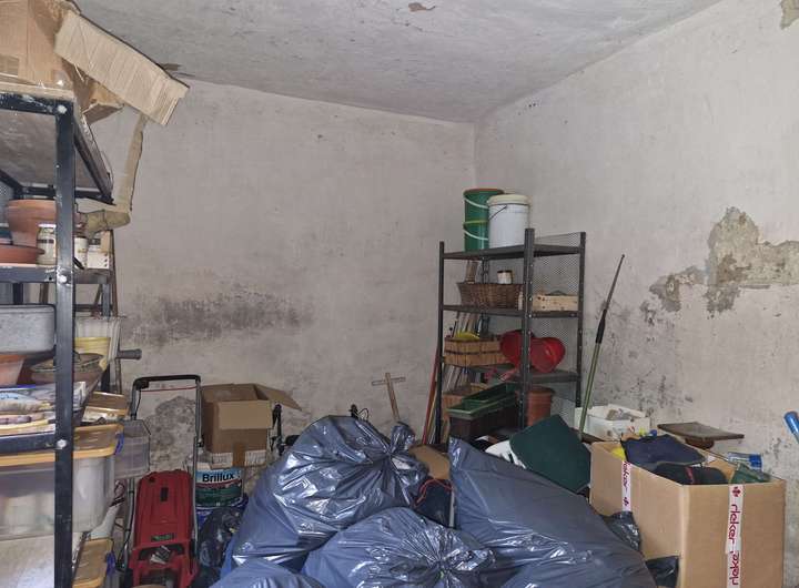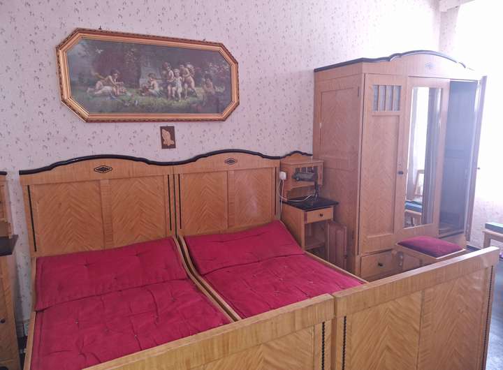 Eine massive Steintreppe führt ins Obergeschoss, wo sich zwei Wohneinheiten befinden. Auf halber Höhe der Treppe steht ein weiteres WC zur Verfügung. Die erste Wohnung verfügt über einen kleinen Flur, ein gemütliches Wohnzimmer, ein Elternschlafzimmer sowie ein Kinderzimmer.