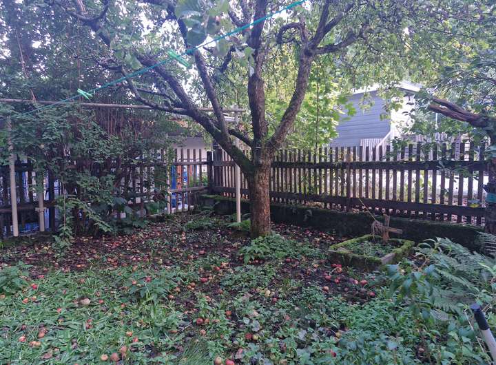 Das etwa 220 m² große Grundstück rundet das Angebot ab. Eine kleine Rasenfläche mit Sträuchern und Bäumen lädt zum Verweilen ein und bietet Platz für eine gemütliche Sitzecke oder einen kleinen Garten.