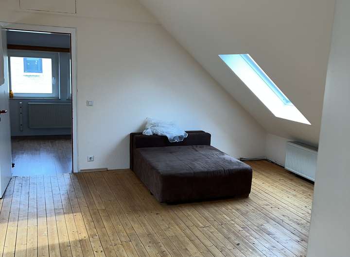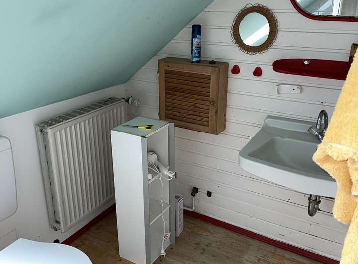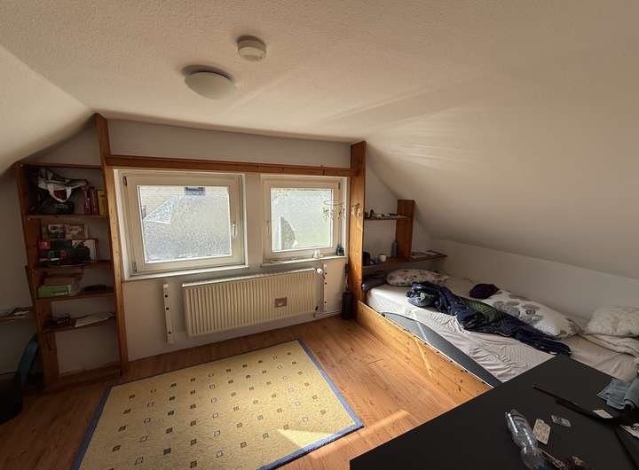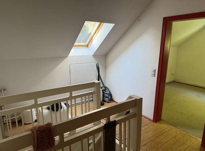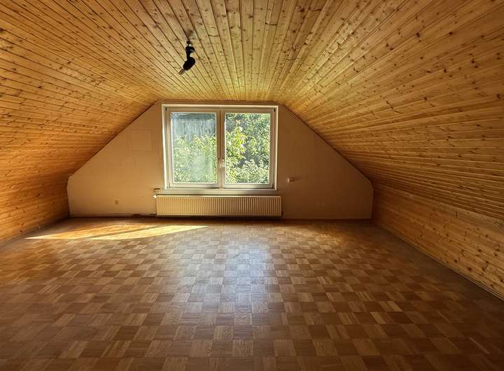 Im Dachgeschoss befinden sich zwei große Räume mit je ca. 34–35 m² Grundfläche sowie zwei weitere Zimmer mit je 15 m² Grundfläche. Ein zusätzliches Badezimmer mit Badewanne und WC ist ebenfalls vorhanden. Die holzvertäfelten Decken und Spielecken in den Kinderzimmern schaffen eine gemütliche Atmosphäre.