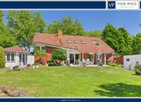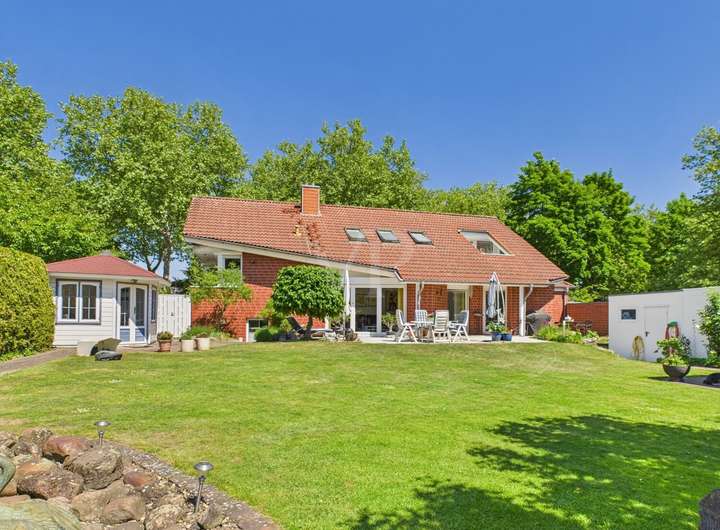 Zum Verkauf steht ein 1992 auf einem ca. 911 m² großen Grundstück in massiver Bauweise fertiggestelltes Einfamilienhaus mit einer Wohnfläche von ca. 196 m². Die Raumaufteilung in Split-Level-Architektur sorgt für spannende Übergänge zwischen den verschiedenen Bereichen des Hauses und schafft ein Gefühl von Offenheit und Weitläufigkeit. Das Erdgeschoss des großzügigen und gleichermaßen gediegenen Wohnhauses betritt man über den Windfang. Von hier gelangt man in das Gäste-WC mit Dusche sowie in die ehemals angrenzende Garage, die im Jahr 2000 zu einem Gästebereich ausgebaut wurde. Weiter geht es in die Diele, von der das Arbeitszimmer, der Wohnbereich sowie das Esszimmer mit Zugang zur Küche abzweigen. Der Wohnbereich ist mit einem Kaminanschluss versehen. Der Zugang zu der Terrasse ist sowohl vom Wohnbereich als auch vom Arbeitszimmer möglich. Über eine Treppe gelangt man in die erste Ebene auf der sich zwei Kinderzimmer, jeweils mit Ausgang zum Balkon, sowie ein Badezimmer mit Dusche befinden. In der zweiten Ebene, über eine weitere Treppe zu erreichen, ist der Elternbereich mit einem großen Badezimmer, Ankleideraum und Schlafzimmer mit Ausgang zum Balkon untergebracht. Weitere Stufen führen von hier zu dem wohnlich ausgebauten Dachboden und einem kleinen Abstellraum. Im Kellerbereich befinden sich zwei Abstellräume und der Heizungsraum mit Ausgang zum Garten. In dem wunderschön angelegten, rundum eingefriedeten Garten mit Teich und Pavillon lässt es sich herrlich entspannen. Ein solide gebauter Unterstand bietet die Möglichkeit zum Aufstellen eines Whirlpools. Zwei Garagen befinden sich unmittelbar neben dem Grundstück und sind direkt vom Garten aus erreichbar. Zudem befindet sich auf dem Grundstück ein Carport mit Gerätehaus. Eine wirklich wunderschöne und durchdachte Immobilie, lassen Sie sich von den Fotos inspirieren und vereinbaren Sie einen Besichtigungstermin!
