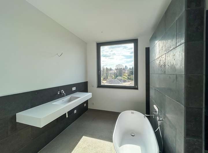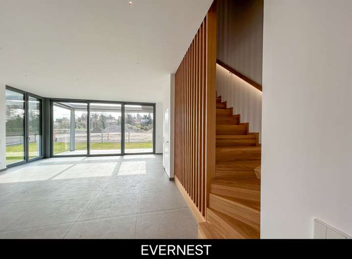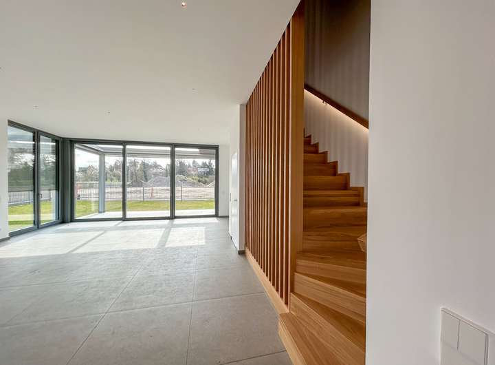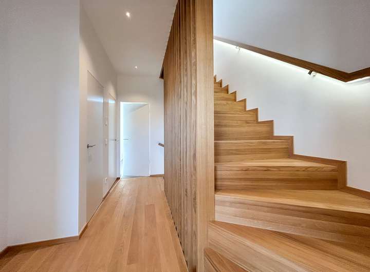 Die Ausstattung überzeugt mit hochwertigen Materialien und modernen Details: Edle Eichendielen, eine stilvolle Eichenholztreppe, Naturstein und Feinsteinzeugfliesen setzen elegante Akzente. Fußbodenheizung sowie innovative Deckenheizung- und Kühlung sorgen für ein behagliches Wohnklima. Außenjalousien, Einbruchschutzfunktionen und integrierte Deckenspots verbinden Komfort und Sicherheit. Selbstverständlich steht Glasfaseranschluss zur Verfügung – perfekt für das Homeoffice.