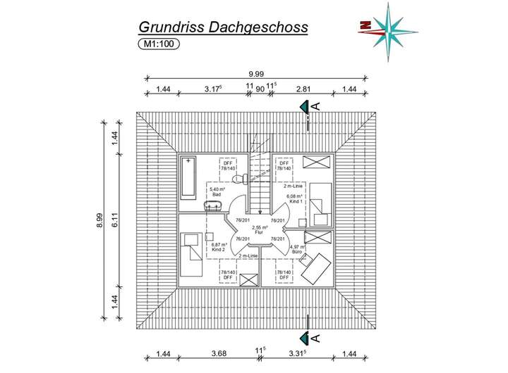 Das ausgebaute Dachgeschoss bietet weiteren Raum für individuelle Nutzungsmöglichkeiten, darunter zwei weitere Schlafzimmer mit ca. 6,08 m² und ca. 6,87 m², ein Büro mit ca. 4,97 m² und ein weiteres Bad mit ca. 5,40 m².
