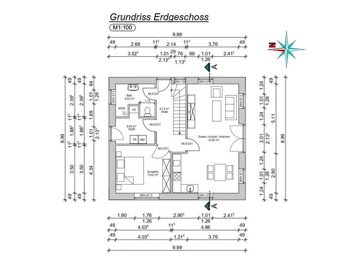 Wohn- und Essbereich (ca. 32,82 m²): Der helle, offene Wohn- und Essbereich bildet das Herzstück des Hauses. Große Fensterflächen schaffen eine freundliche Atmosphäre, eröffnen den Blick ins Grüne und führen direkt auf die sonnige Terrasse. Die Raumgestaltung lässt viel Freiheit für individuelle Einrichtungsideen.
