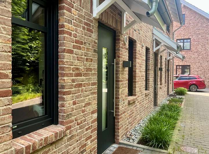 Die Stadthäuser bestechen durch ein hochwertiges Verblendmauerwerk, Freigebinde mit Giebelschmuck sowie große Fensterflächen und fügen sich somit harmonisch in die grüne Umgebung ein.