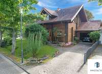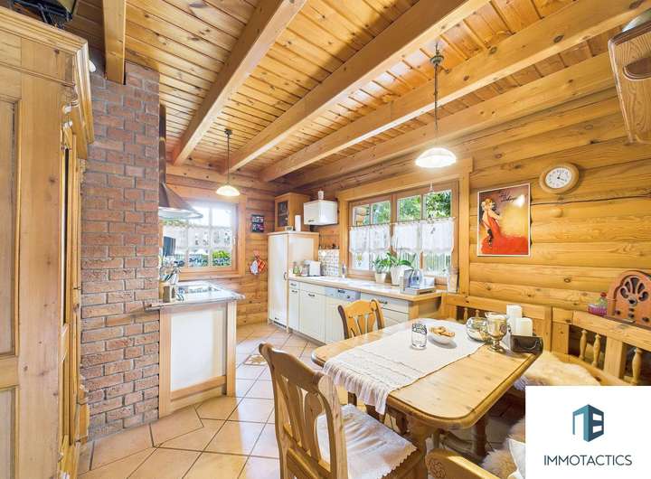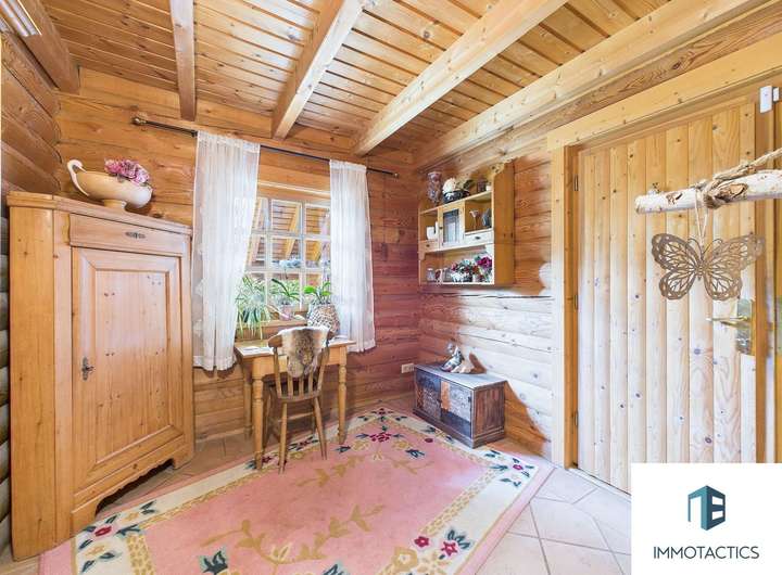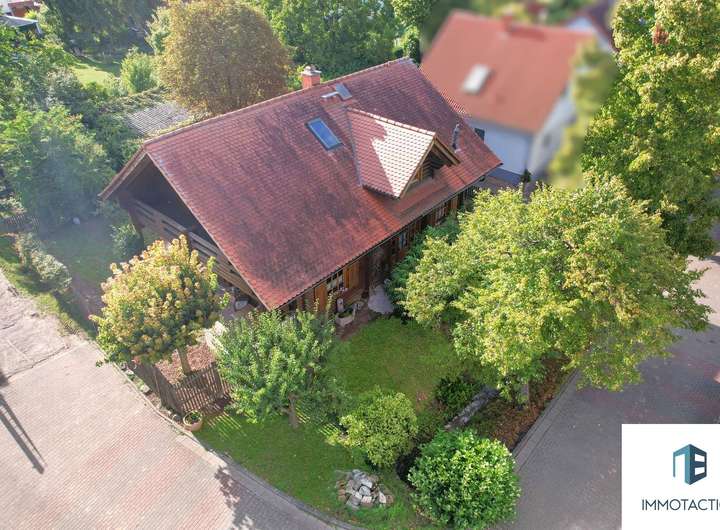 Dieses freistehende Einfamilienhaus wurde 1997 in hochwertiger Blockbohlenbauweise errichtet. Verarbeitet wurde nordische Kiefer aus Finnland – sichtbar in den warmen Holzflächen und den kräftigen Balken. Die Gebäudehülle ist sehr gut gedämmt und sorgt ganzjährig für ein angenehm ausgeglichenes Wohnklima. Die natürliche Materialität des Holzes verleiht dem Haus eine ruhige, einladende Atmosphäre – viele empfinden sie als wohnlich, klar und geborgen. Auf rund 155 m² Wohnfläche entfaltet sich ein freundliches Zuhause mit viel Raum zum Wohlfühlen. Im Erdgeschoss gehen Diele, Küche mit Essbereich und der Wohnraum mit Kamin fließend ineinander über. Der Kamin, welcher als Speicherofen das ganze Haus heizen kann unterliegt keiner Sanierungspflicht und ist somit perfekt als zusätzliche Wärmequelle nutzbar. Große Fenster bringen viel Tageslicht ins Haus und öffnen den Blick in den Garten. Praktisch sind die kurzen Wege: Nebenräume für Wäsche und Vorräte sind ebenso vorhanden wie ein zusätzlicher Raum, der sich fürs Homeoffice oder Gäste eignet. Besonders komfortabel ist die Fußbodenheizung und der kleine Wellnessbereich im Erdgeschoss: Direkt neben der Sauna steht ein Duschbad zur Verfügung – ideal nach Sport, Gartenarbeit oder an kühlen Tagen. Ein separates Gäste-WC ergänzt die Ebene. Im Obergeschoss erwartet Sie ein helles Schlafzimmer, weitere Zimmer für Kinder sowie ein Tageslichtbad, das mit einer komfortablen Fußbodenheizung ausgestattet ist. Diese sorgt nicht nur für angenehm warme Füße, sondern verteilt die Wärme gleichmäßig im gesamten Bad und schafft dadurch ein behagliches Wohlfühlklima. Ein Zimmer verfügt über eine Empore, die sich als gemütlicher Schlafplatz oder als erhöhte Spielecke nutzen lässt – ein Detail, das Kindern gefällt und den Raum flexibel macht. Alternativ kann die Empore auch als zusätzlicher Stauraum genutzt werden. Der langgezogene Balkon unter dem Dach schützt vor Wetter und erweitert in den warmen Monaten den Wohnbereich nach draußen. Der Außenbereich ist großzügig und grün. Auf der gepflasterten Terrasse finden Tisch, Lounge und Grill bequem Platz; Rasenflächen und gewachsene Bepflanzung geben dem Garten einen privaten, entspannten Charakter. Vor dem Haus liegt ein Vorgarten, entlang verläuft ein kleiner Bach – das unterstreicht das naturnahe Bild und die ruhige Lage. Zum Haus gehört ein geschlossener Carport mit direktem Zugang zu Abstell- bzw. Werkstattflächen. Ein Tor ist derzeit nicht verbaut, kann bei Bedarf jedoch unkompliziert nachgerüstet werden. Die Zufahrt liegt in einer Sackgasse die zur Spielstraße ernannt ist, der Verkehr ist entsprechend gering - für Kinder ideal. Das familienfreundliche Umfeld und die Nähe ins Grüne machen den Standort besonders attraktiv. Abgerundet wird das Gesamtbild durch den nachhaltigen Charakter: Holz als nachwachsender Rohstoff bindet CO₂, die langlebige Bauweise und die sehr gute Dämmung unterstützen einen ressourcenschonenden Betrieb – für ein Zuhause, das sich gut anfühlt und verantwortungsvoll wirtschaftet.