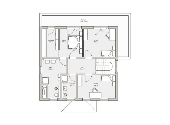Über eine u-förmige Treppe erreicht man das Obergeschoss. Hier befinden sich zwei Kinderzimmer und ein Duschbad. Der separate Elternbereich besteht aus einem Schlafzimmer mit Ankleide und einem eigenem Badezimmer. So haben die Eltern die Möglichkeit sich zurückzuziehen.
