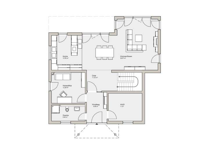 Willkommen im neuen Zuhause! Die Stadtvilla Gredo mit 183 m² wird Bauherren glücklich machen. Die edle Villa betritt man durch einen Windfang, der mit einer Glastür vom großzügigen Wohnbereich getrennt ist. Der offene Wohn- und Essbereich überzeugt mit knapp 40m² und bietet mit großen Fensterelementen ausreichend Licht. Daran schließt die große Küche mit Kochinsel an. Somit wird aus diesem Bereich das gesellige Herzstück des Hauses. Im Erdgeschoss zu finden sind außerdem ein Home-Office, ein Duschbad und der Hauswirtschaftsraum.