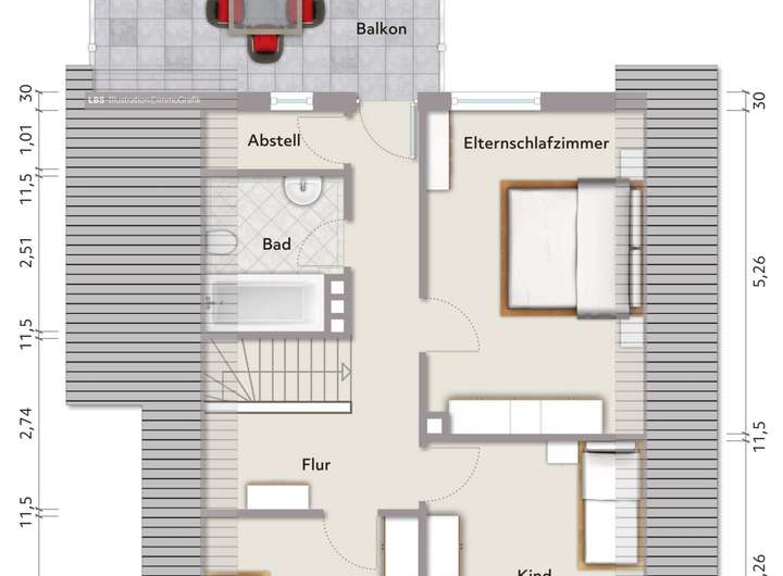 Im Obergeschoss befinden sich folgende Räumlichkeiten: