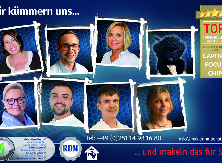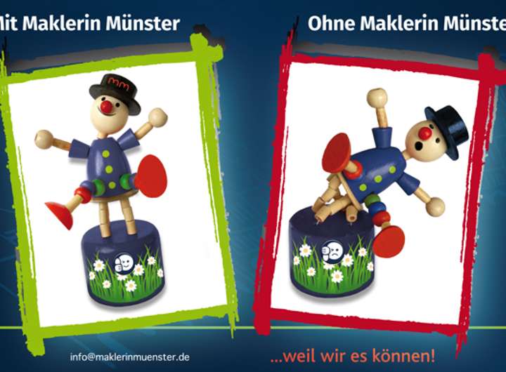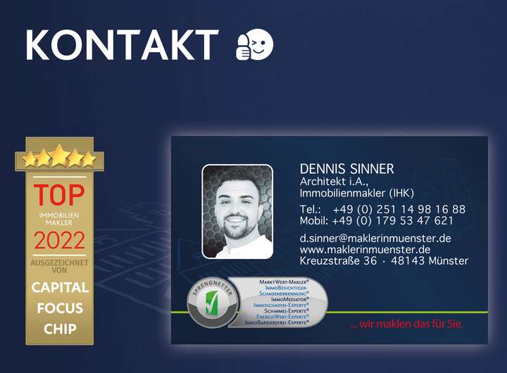 Fotos und Grafiken unterliegen dem Copyright der Firma Maklerin Münster. Bezüglich der Objektdaten ist die Firma Maklerin Münster auf die Auskünfte der Verkäufer / Vermieter, Bauträger, oder der Behörden angewiesen. Für die Vollständigkeit und Richtigkeit kann daher keine Haftung übernommen werden. Schadensersatzansprüche sind aus diesen Gründen uns gegenüber ausgeschlossen. Irrtum bleibt ausdrücklich vorbehalten.
