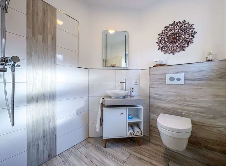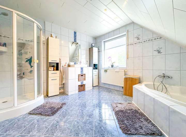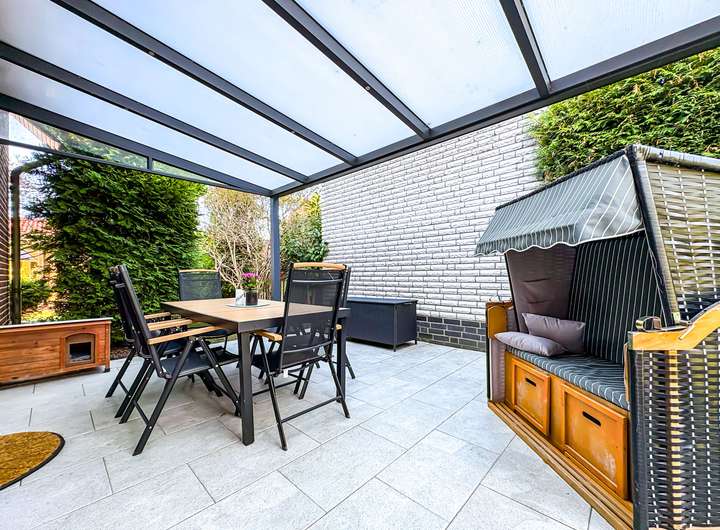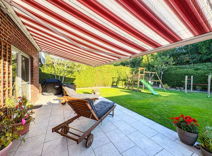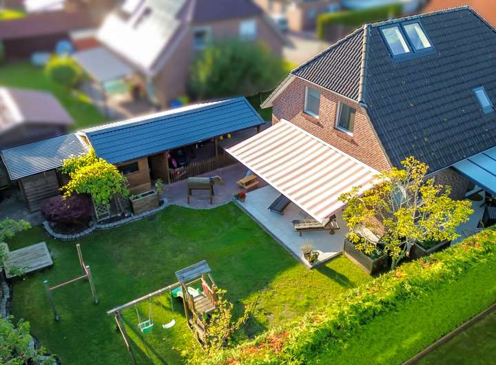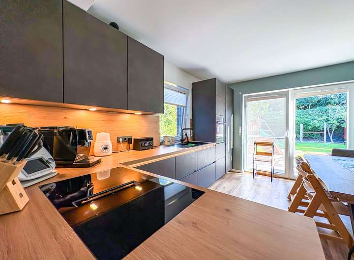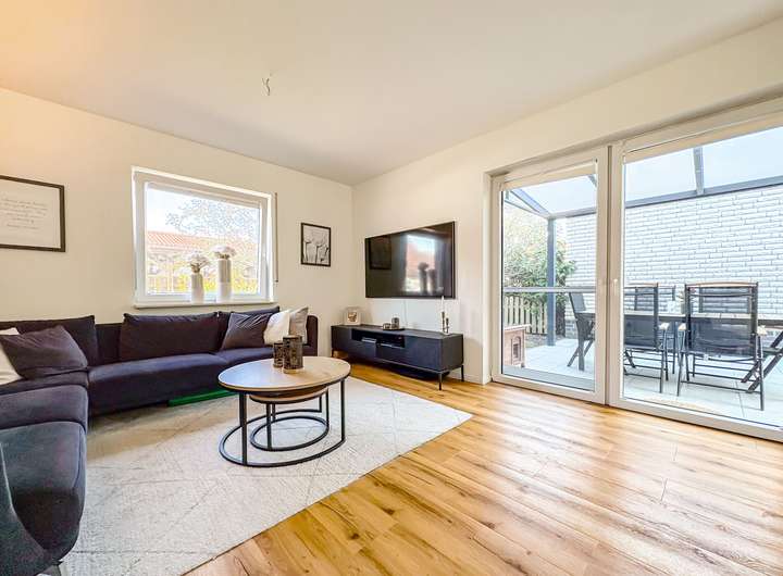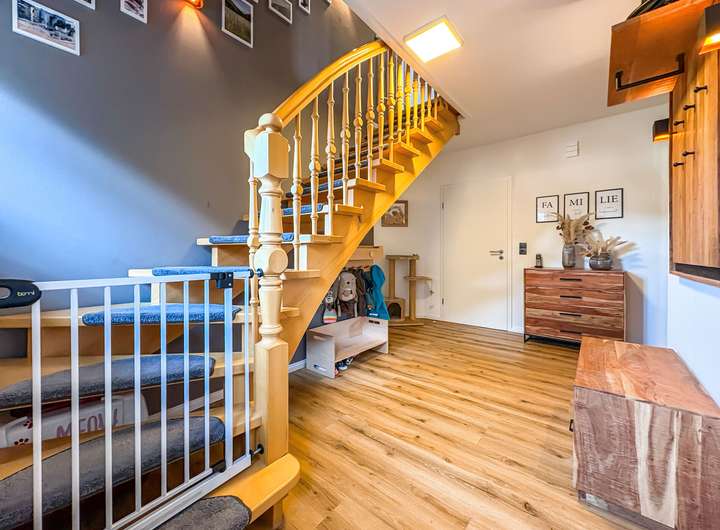 Der Außenbereich überzeugt mit einer kleinen, überdachten Terrasse und einer großen Terrasse mit elektrischer Markise – perfekt für entspannte Stunden mit Familie und Freunden. Dank der Sackgassenlage genießen Sie hier Ruhe, Geborgenheit und Privatsphäre. Eine Immobilie, die modernes Wohnen und ein harmonisches Lebensumfeld ideal miteinander verbindet.