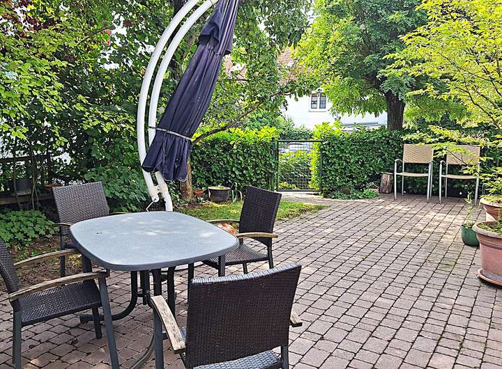 Die mit Bäumchen, Hecken und Pflanzen prächtig eingesäumte Außenanlage ist sehr abwechslungsreich gestaltet und in mehreren Ebenen unterteilt. Von der dominierenden Südwest-Terrasse mit Grünfläche aus begeht man ein paar Stufen tiefer einen weiteren Gartenanteil (ebenso nach Südwest) und gelangt in anderer Richtung zum Kfz-Stellplatz.