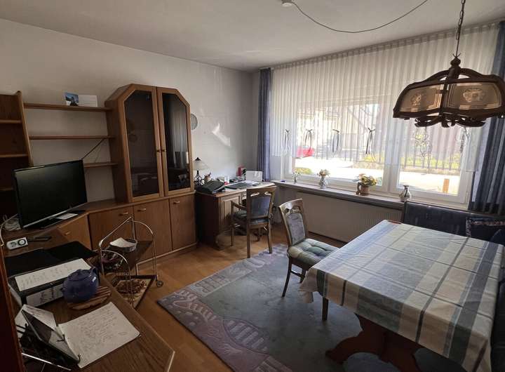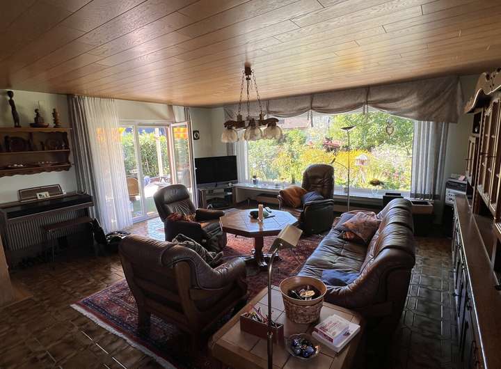 Das Haus wurde 1970 errichtet und verfügt über eine Wohnfläche von rd. 126 m² . Die jetzigen Eigentümer hatten auf ein Schlafzimmer verzichtet um mit Hilfe eines Wanddurchbruches den Wohnbereich noch großzügiger gestalten zu können. So befinden sich momentan 2 Schlafräume sowie ein kleiner Raum, der als Arbeitszimmer gekennzeichnet ist nebst Bad und Küche auf der Wohnebene. Der Wohnraum verfügt über große Fensterflächen, die den Blick in den Garten freigeben. Ebenso befindet sich dort ein Kaminofen. Die Küche hat eine gute Größe und befindet sich angrenzend an den Wohnbereich.