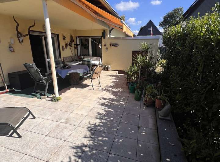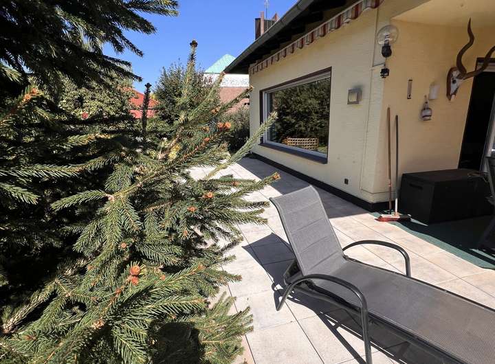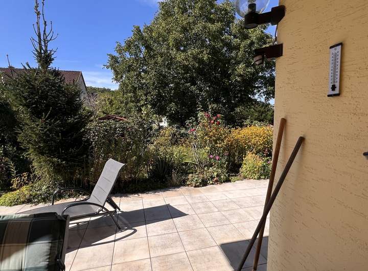 Die Terrasse vor dem Wohnzimmer ist großzügig bemessen und lädt durch den ausladenden Dachüberstand be jedem Wetter zum Verweilen ein. Von der Terrasse aus erreicht man auch die Garage. Der Garten wird auf der anderen Seite durch ein Gartentor vor Einblicken geschützt.