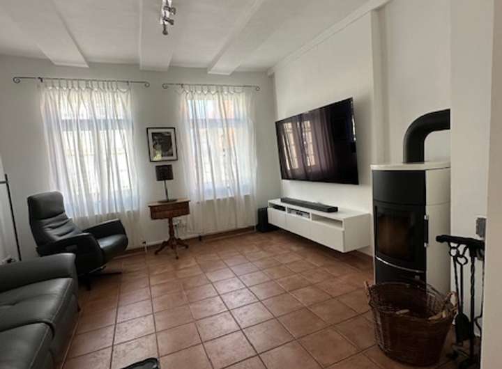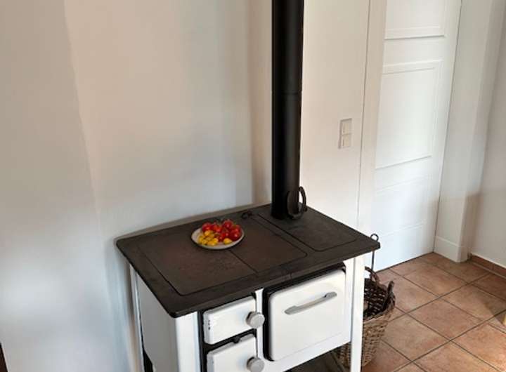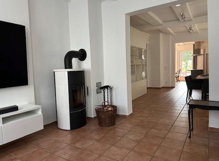 Der vorhandene Kaminofen verleiht dem Erdgeschoss eine warme und einladende Atmosphäre. Mit seiner effizienten Heizleistung sorgt er nicht nur für wohlige Wärme an kalten Tagen, sondern auch für ein gemütliches Ambiente, das zum Entspannen und Verweilen einlädt. Die große Sichtscheibe ermöglicht einen ungehinderten Blick auf das flackernde Feuer.
