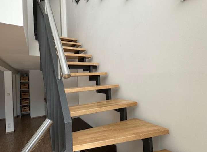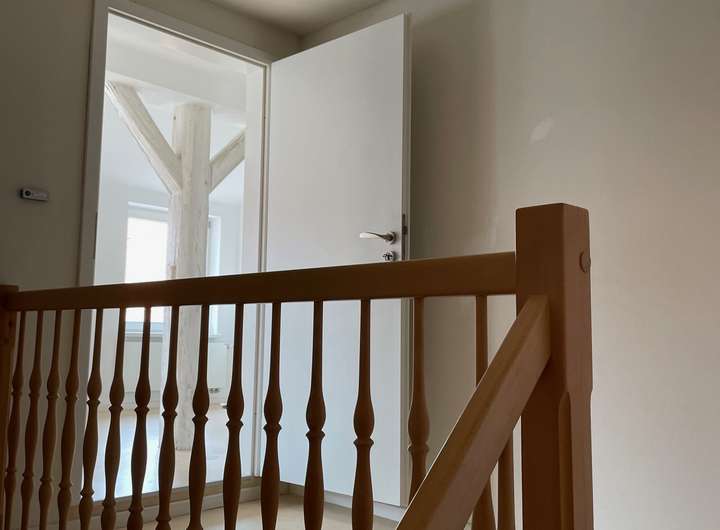 Über eine Holztreppe erreichen Sie das Obergeschoss sowie das Dachgeschoss. Das Obergeschoss wird derzeit gesamtheitlich genutzt, so dass die vorhandene Einbauküche für beide Wohneinheiten dient.