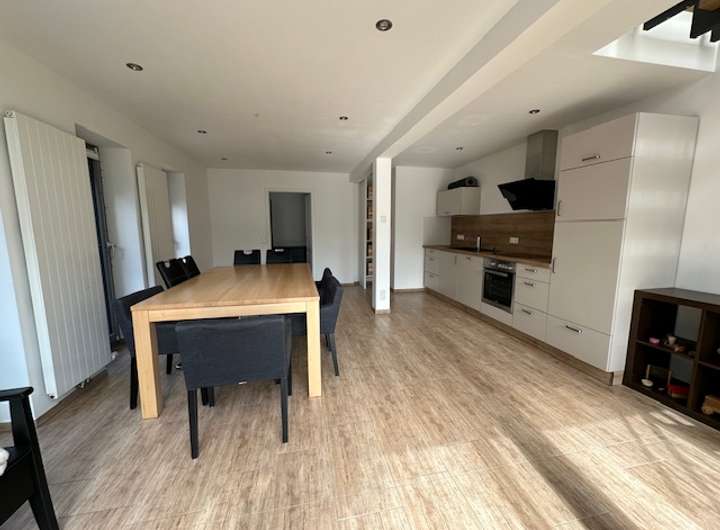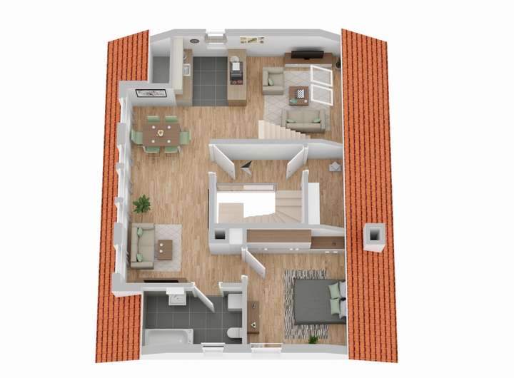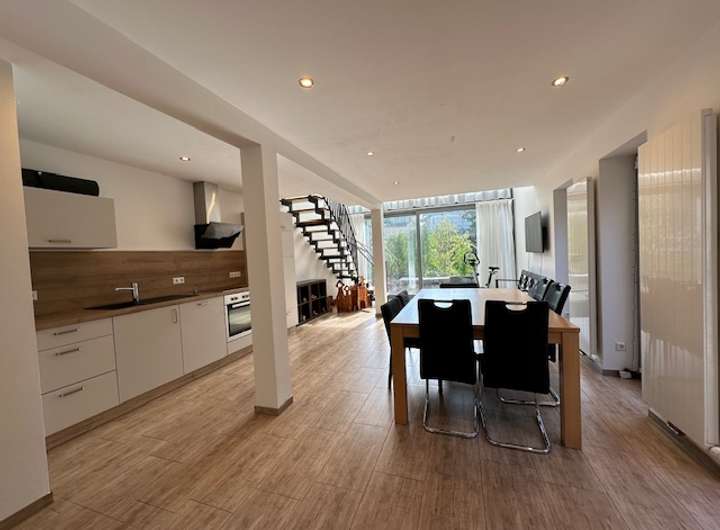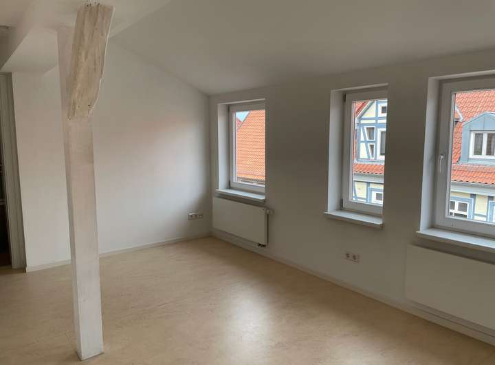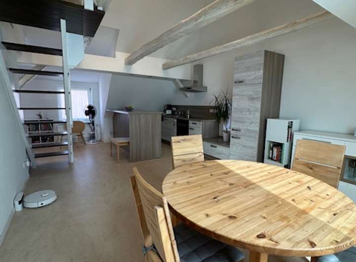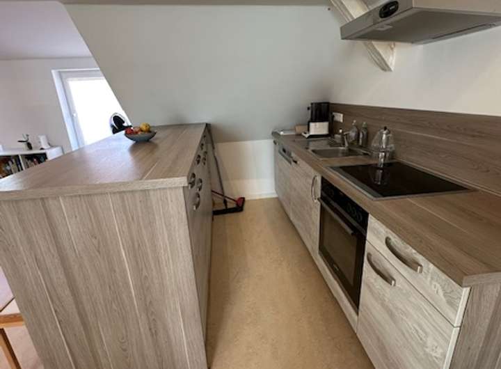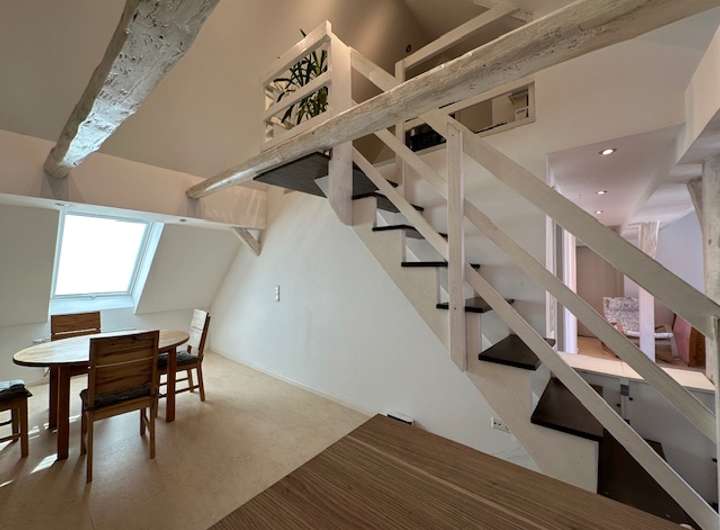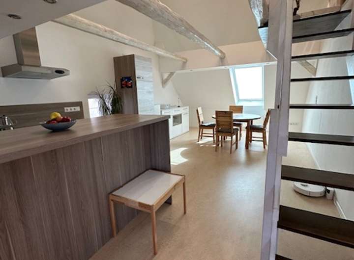 Das Dachgeschoss beeindruckt durch einen offenen Wohn-Essbereich, der durch seine hohen Decken und wunderschönen Balken eine einladende Atmosphäre schafft. Insgesamt stehen Ihnen 3 Zimmer (inkl. Dachboden) mit ca. 70 m² Wohnfläche zur Verfügung. Die vorhandene Einbauküche ist hier selbstverständlich im Kaufpreis enthalten. Das freundliche Badezimmer ist mit einer Badewanne ausgestattet.