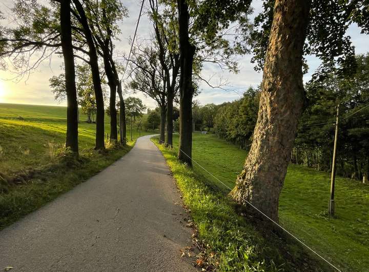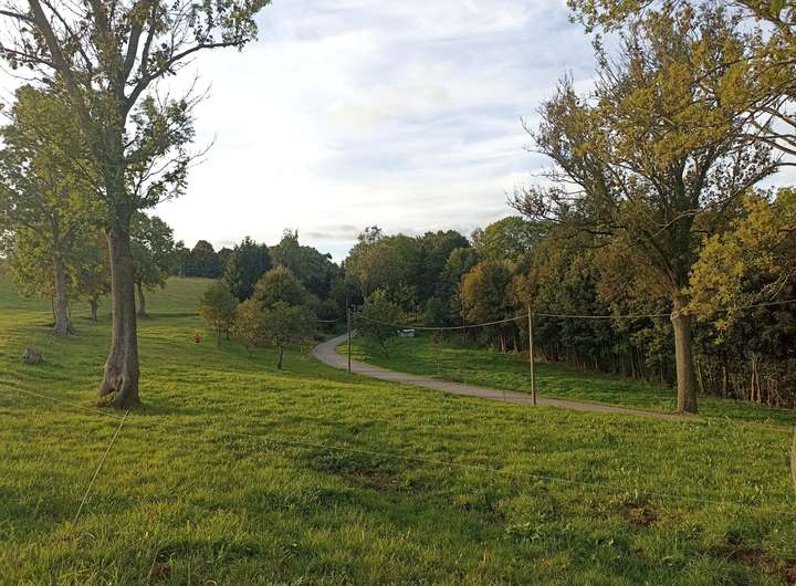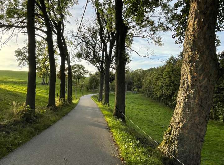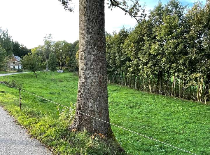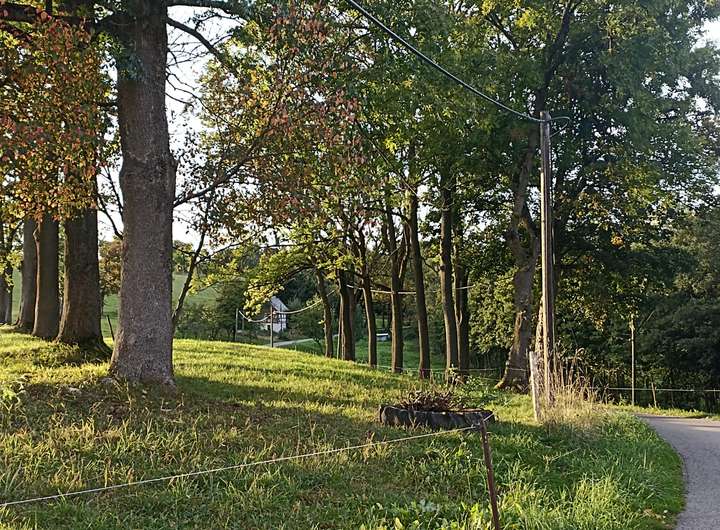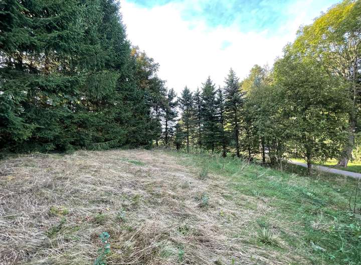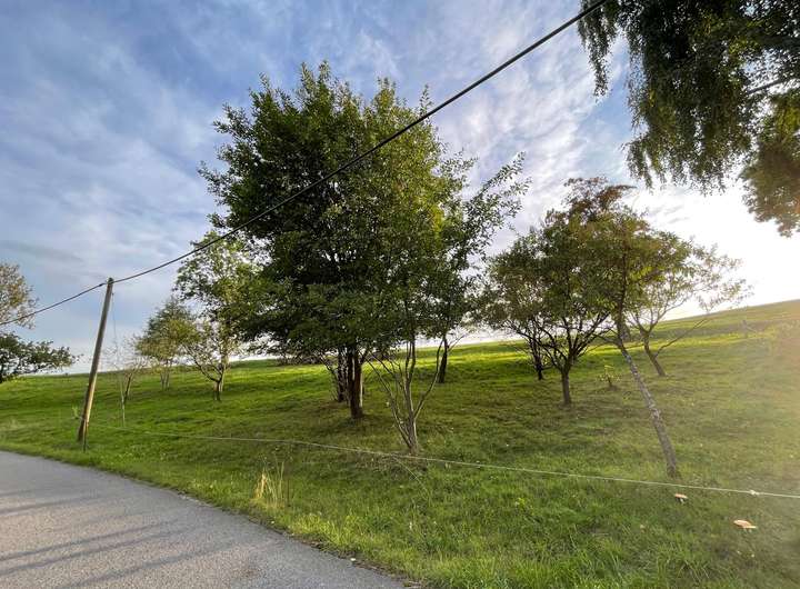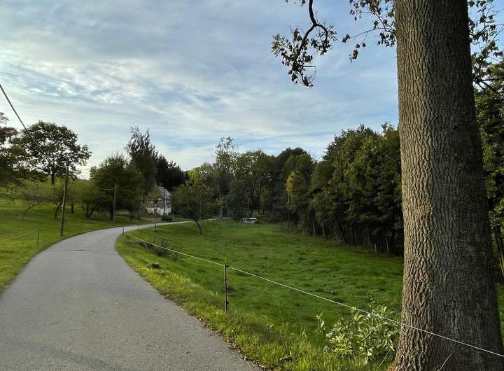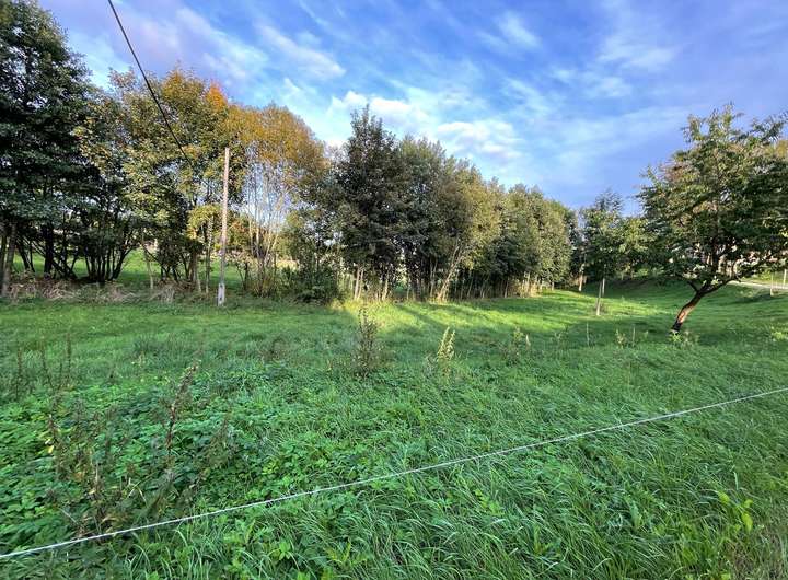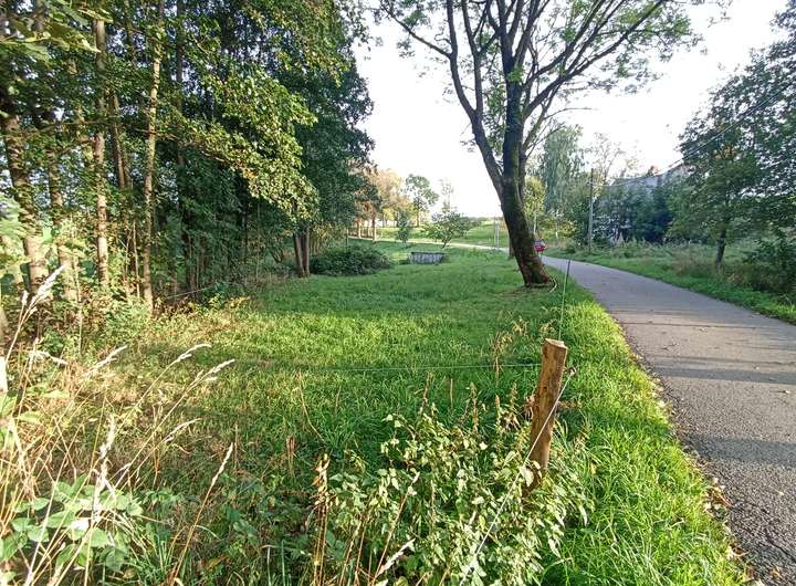 Gegenüber vom Hausgrundstück auf der anderen Straßenseite liegt das zweite Flurstück (919 m2). Dieses Wiesenareal verläuft parallel zum Hausgrundstück zwischen dem Sträßchen und einem kleinen Bach.