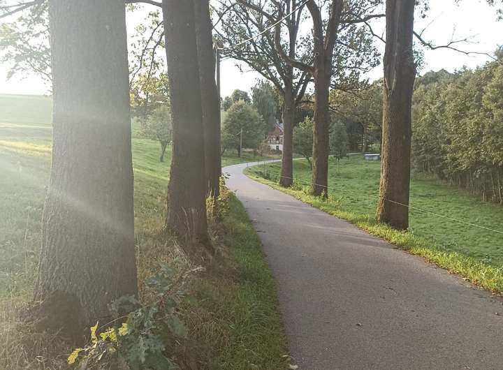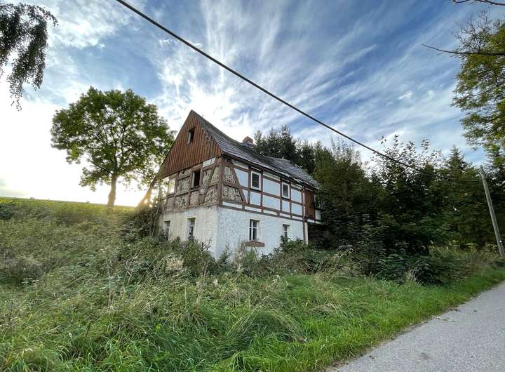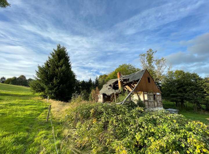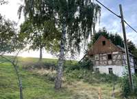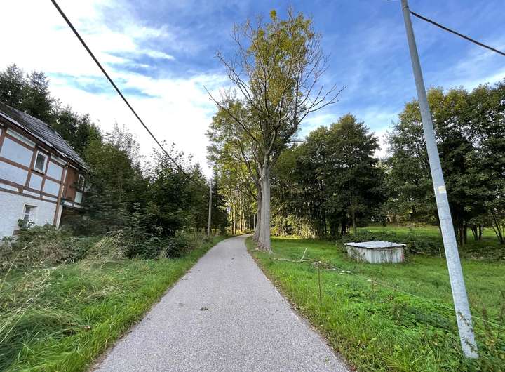 Bei dem links/westlich von der kleinen Straße gelegenen Flurstück (1554 m2) handelt es sich um ein wunderschönes Hanggrundstück in absoluter Alleinlage mit Blick auf das angrenzende Feld und den Horizont. Auf diesem Grundstück befindet sich die Ruine eines typischen alten Erzgebirgshäuschens (Fachwerk).