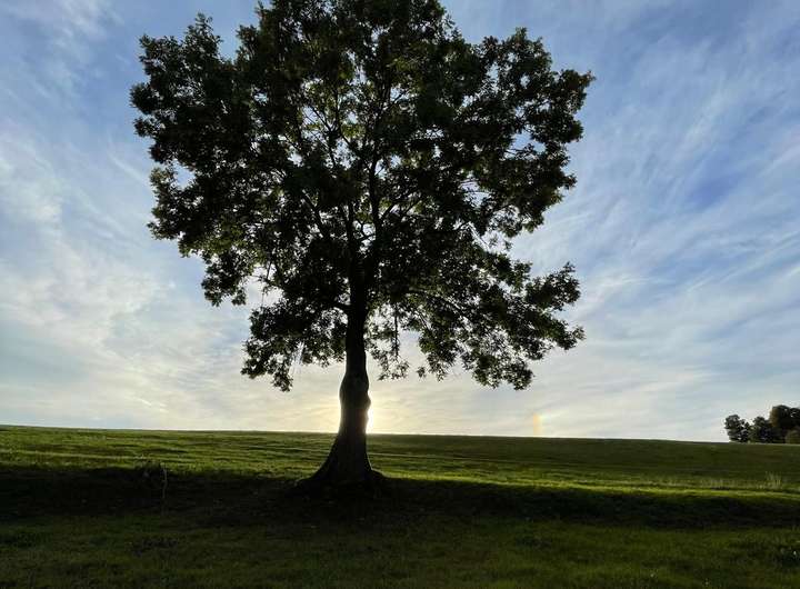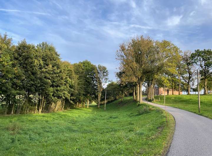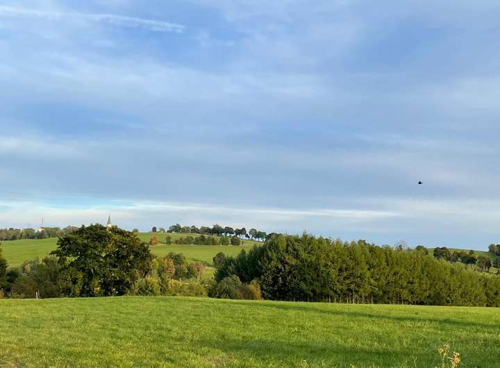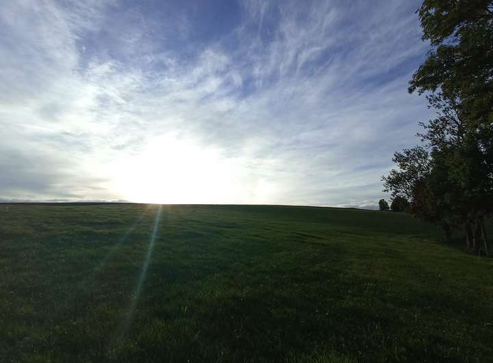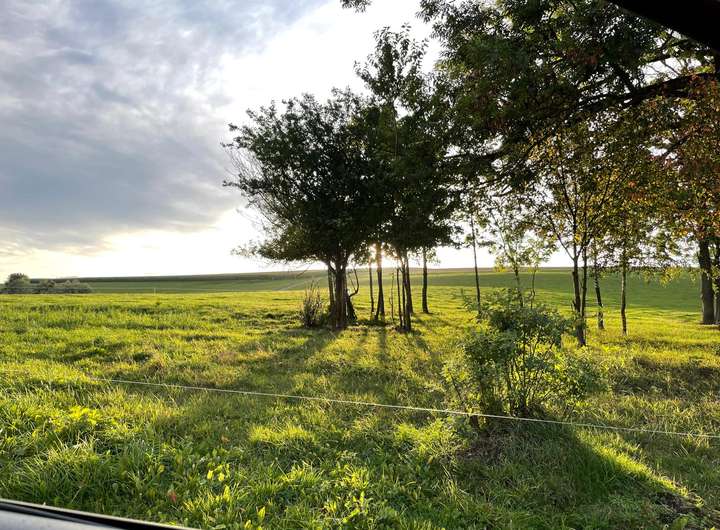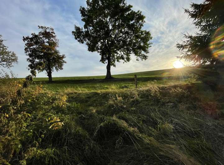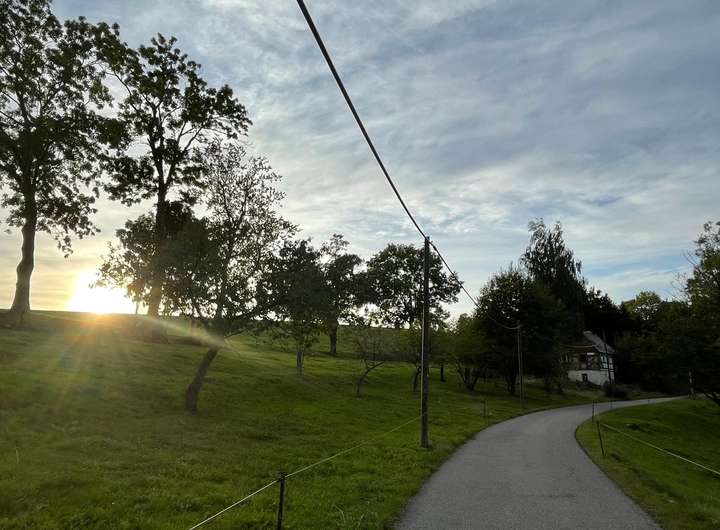 Die Rückseite des Hauses liegt am Hang mit viel Nachmittagssonne, Blick auf Feld, Horizont und Sonnenuntergang.
