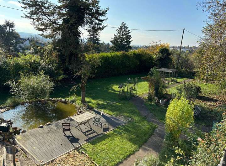 Dieses außergewöhnliche Einfamilienhaus in Wiesbaden-Schierstein verbindet Wohnkomfort, Großzügigkeit und Naturidylle auf einzigartige Weise. Das Haus bietet 181,5 m² Wohnfläche auf zwei Etagen mit fünf Zimmern und vielseitigen Nutzungsmöglichkeiten. Herzstück ist der offene Wohn- und Essbereich mit angrenzender Küche sowie einer großzügigen 30m² großen Terrasse. Ergänzt wird das Erdgeschoss durch ein Gäste-WC, ein Bad sowie eine separate Einliegerwohnung - ideal für Familien mit Kindern, Gäste oder als abgeschlossener Wohn -und Arbeitsbereich. Im Dachgeschoss erwartet Sie ein großzügiges Schlafzimmer, ein modernes Bad mit Wanne und Dusche, ein Ankleidezimmer sowie ein großes Büro. Die Dachterrasse ist über den Flur zugänglich und bietet Privatsphäre sowie einen schönen Blick ins Grüne. Zusätzlich befindet sich im Untergeschoss neben einem praktischen Stauraum ein großzügiger Weinkeller - ein echtes Highlight für Genießer und Sammler. Das rund 3.726 m² große Grundstück ist ein echtes Highlight: alter Baumbestand, Rosen, ein idyllischer Teich, Terrasse sowie ca. 20 Obstbäume (u. a. Apfel, Birne, Kirsche, Pflaume, Johannisbeere) schaffen ein Gartenparadies, das in dieser Lage seinesgleichen sucht. Hier wohnen Sie mit dem Lebensgefühl von Freiheit, weit von den Nachbarn entfernt, eingebettet in Natur und dennoch bestens angebunden. Dieses Zuhause eignet sich ideal für Familien, Eigennutzer oder Ruhesuchende, die großzügigen Wohnraum, viel Privatsphäre und ein außergewöhnliches Grundstück suchen.
