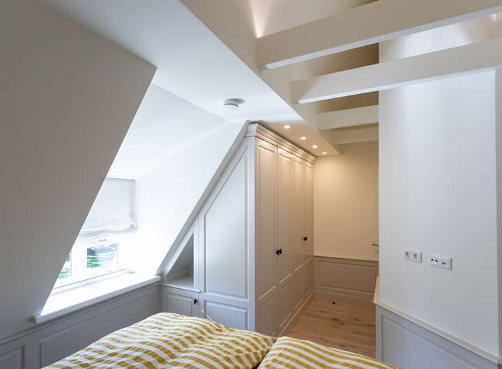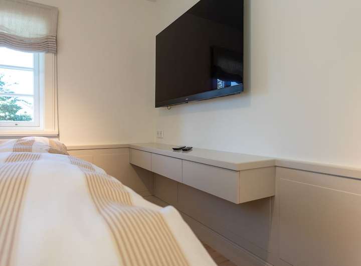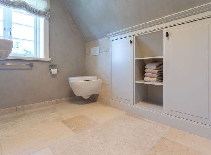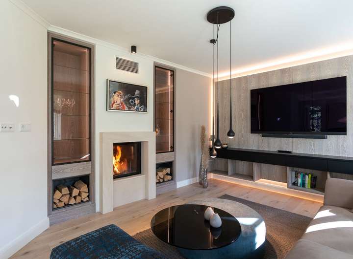 Als Bodenbeläge wurden weiß geölte Eichendielen in den Wohn- und Schlafräumen gewählt. In den Bädern sowie im Eingangsbereich sorgt Naturstein für eine zeitlose, elegante Anmutung. Ein Kamin im Wohnbereich schafft darüber hinaus eine warme und behagliche Atmosphäre – besonders in der kühleren Jahreszeit ein geschätzter Rückzugsort.