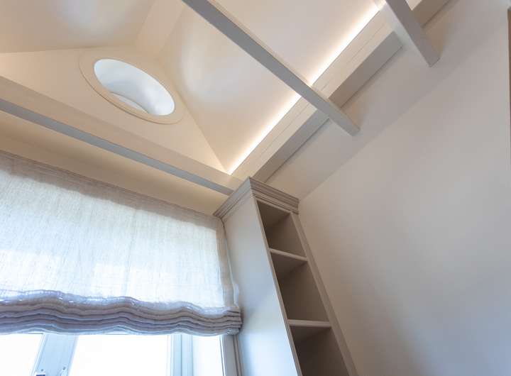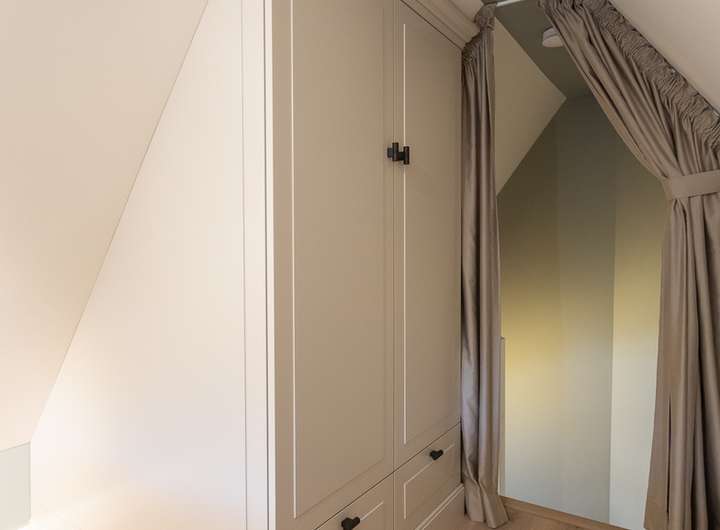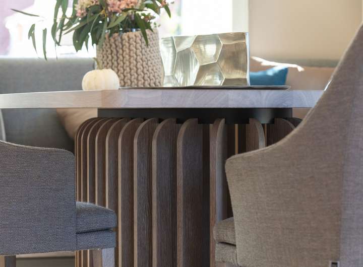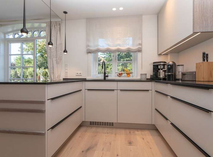 Ein zentrales Element bildet die ebenfalls vom Tischler entworfene Küche, ausgestattet mit hochwertigen Geräten von Gaggenau. Sie steht exemplarisch für die gestalterische Klarheit und die kompromisslose Ausführungsqualität, die sich durch das gesamte Interieur zieht.