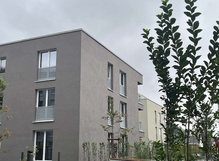 Die Wohnanlage besteht aus 6 Mehrfamilienhäusern, als sozial gemischtes Quartier, die um den Nachbarschaftshof gruppiert sind. Dort findet man gemeinsame Garten- bzw. Parkanlage sowie Spielflächen mit angenehmer Aufenthaltsqualität. Blick- und Wegebeziehungen orientieren sich hin zu dieser gemeinsamen Mitte mit Spielfläche.