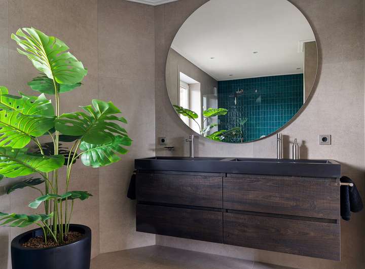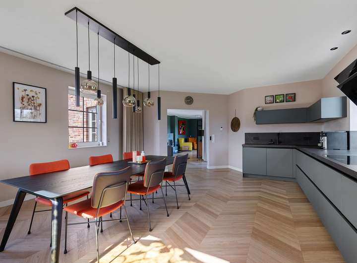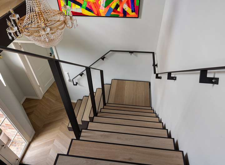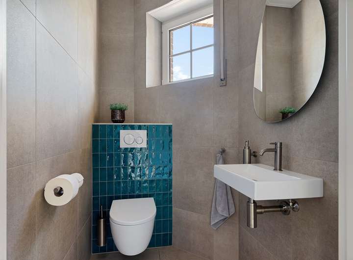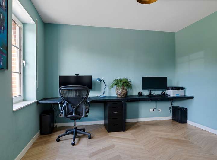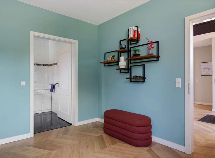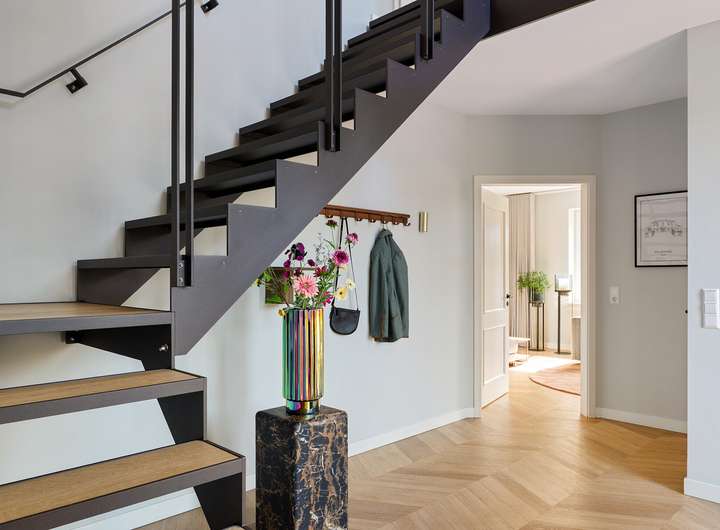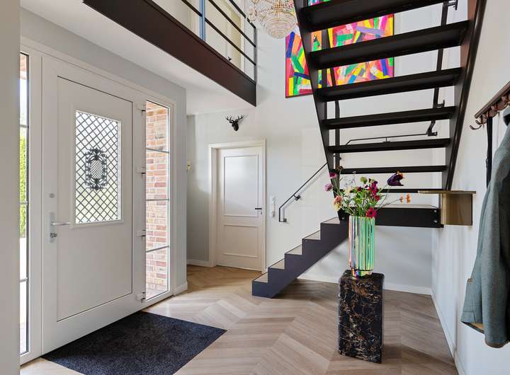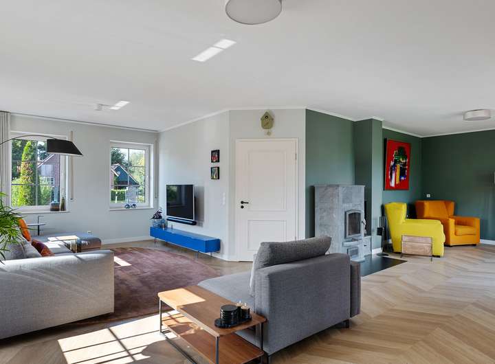 Im Inneren überzeugt die Villa mit einer eindrucksvollen Empfangshalle, in der eine neu eingebaute Designertreppe sofort ins Auge fällt. Von hier aus gelangt man in den lichtdurchfluteten Wohn- und Essbereich ausgestattet mit bodentiefen Fenstern, direktem Zugang zur Sonnenterrasse und einem Ofen. Die angrenzende Wohnküche begeistert mit einer hochwertigen Einbauküche von Siemens, ausgestattet mit modernsten Geräten. Auf derselben Ebene befinden sich außerdem ein stilvoll erneuertes Gäste-WC und ein Hauswirtschaftsraum. Ein zusätzliches Zimmer, das derzeit als Büro genutzt wird, bietet mit eigenem Duschbad flexible Nutzungsmöglichkeiten.