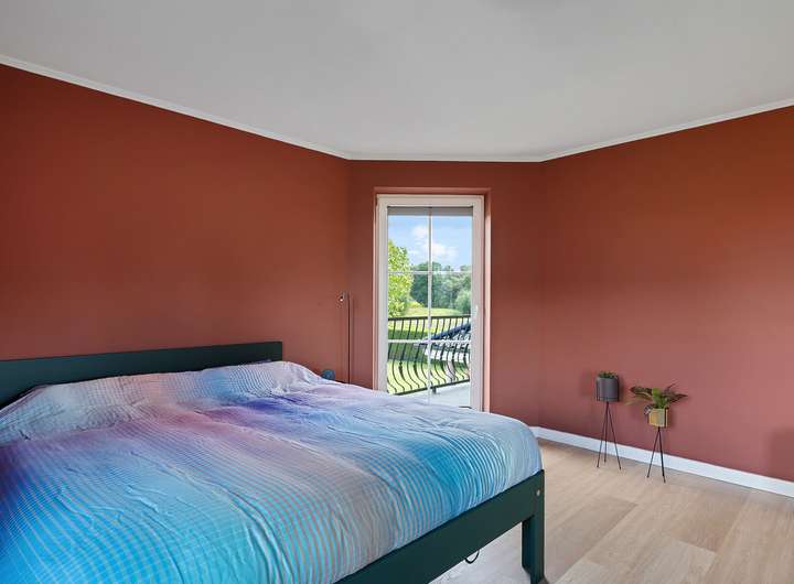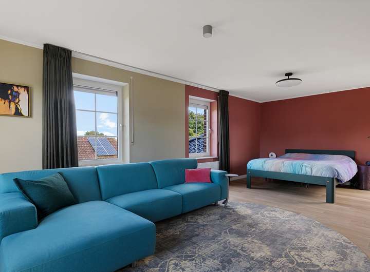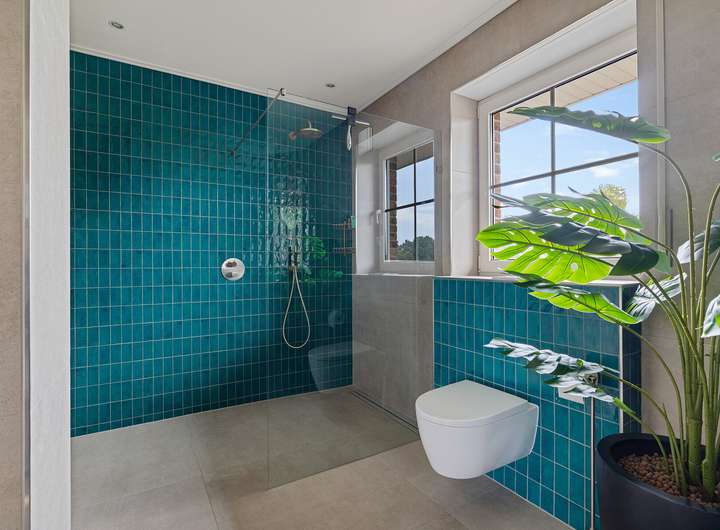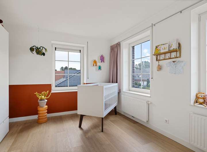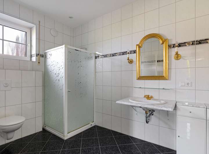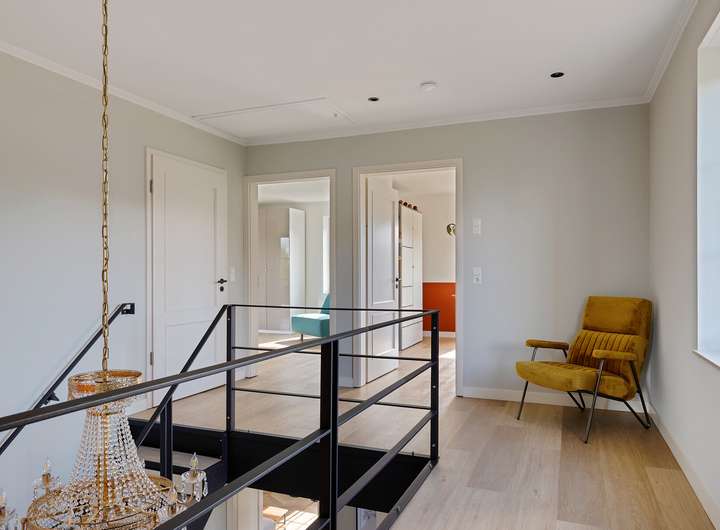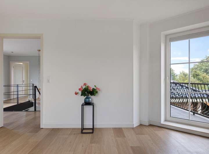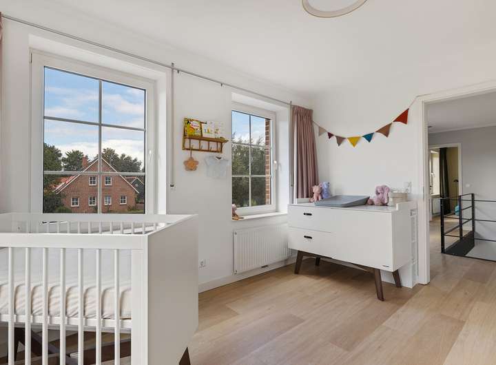Im Obergeschoss eröffnet sich ein durchdachtes Raumkonzept: Ein rund 31 m² großes Elternschlafzimmer mit Balkonzugang, zwei weitere helle Zimmer für Kinder oder Gäste sowie ein luxuriöses Badezimmer mit Dusche, Doppelwaschbecken und WC. Auch von hier aus genießt man den Blick ins Grüne und die Ruhe der Umgebung.