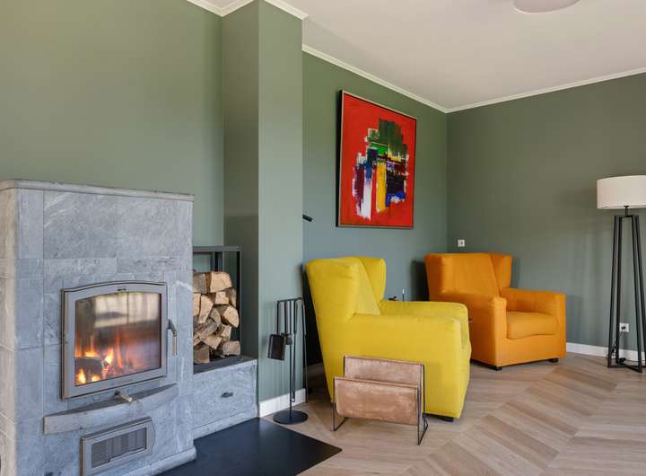 - Ofen im offene Wohnbereich mit Zugang zum Garten