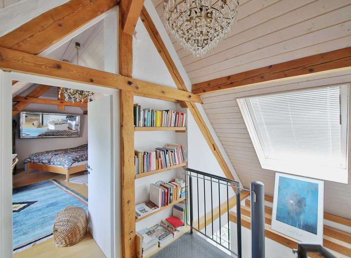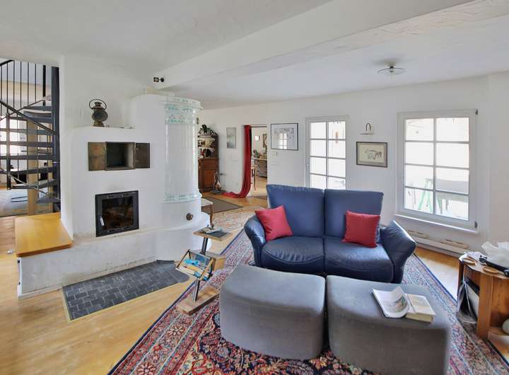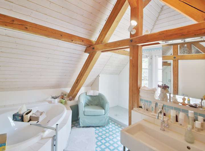 Die Ausstattung ist hochwertig: moderne Küchen, mehrere Bäder (darunter ein Bad mit Eckwanne, Dusche, WC und Bidet), helle Wohnräume, Ankleidezimmer und ein antiker schwedischer Kachelofen.