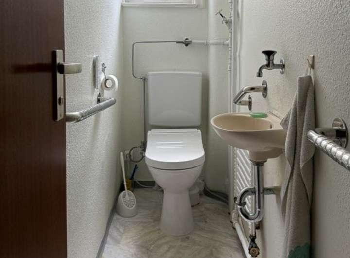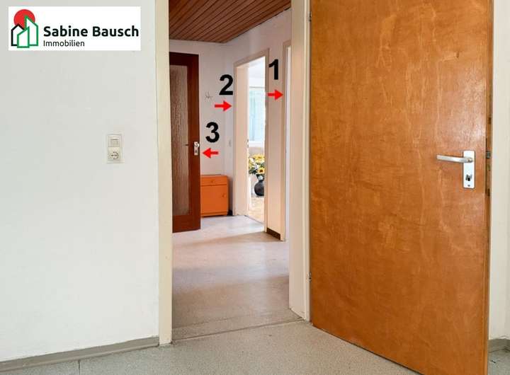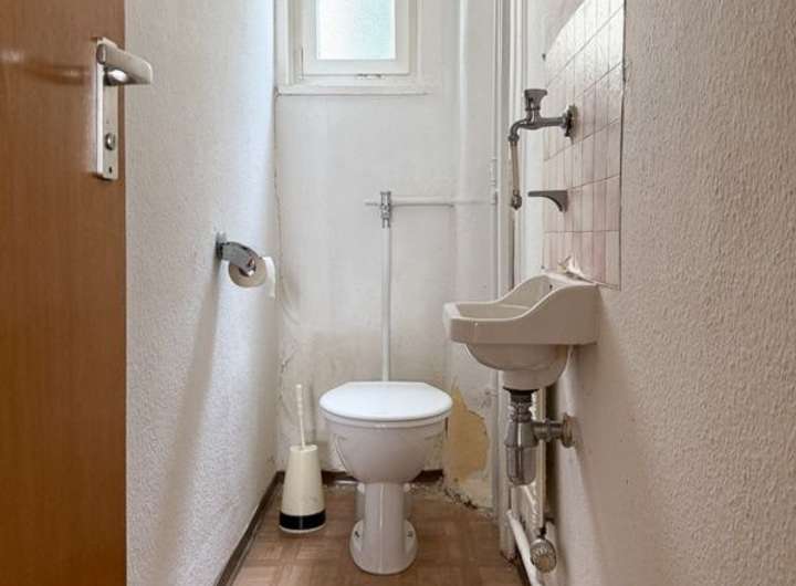 Im Erdgeschoss betreten Sie eine gut geschnittene Dreizimmerwohnung mit rund 75 m² Wohnfläche. Sie werden in der Diele begrüßt. Links befindet sich eine separate Tageslichttoilette. Rechts von der Diele befindet sich die Küche mit anschließendem Badezimmer, das aus einer ehemaligen Veranda entstanden ist. Zwei Wohnräume liegen gegenüber der Eingangstür, ein drittes Zimmer wurde auf der linken Seite der Diele angeordnet. Sehr angenehm ist die Deckenhöhe von 2,65 m.