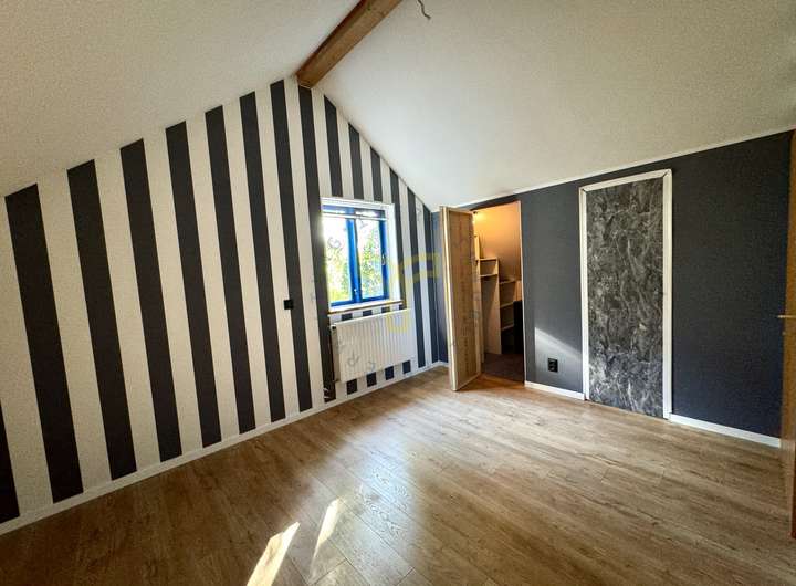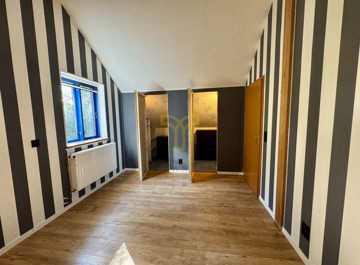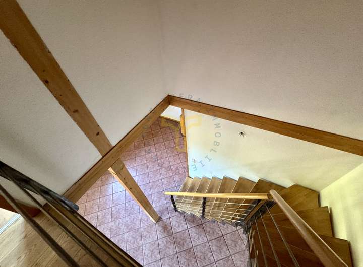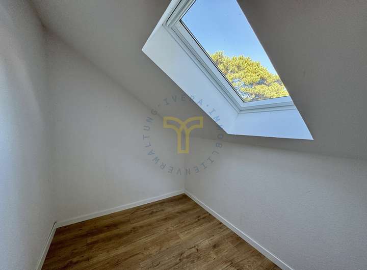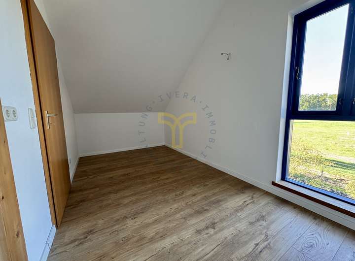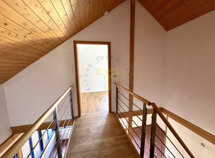 Das Haus bietet drei Zimmer sowie einen großzügigen, offenen Wohn- und Küchenbereich, der durch seine Helligkeit und Weitläufigkeit besticht. Von hier führt eine elegante Treppe ins Dachgeschoss, wo ein offener Luftraum ein einmaliges Raumgefühl vermittelt und zusätzliche Wohnqualität schafft.