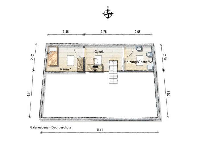 * Galerieebene mit weiterem Zimmer und Gäste-WC,