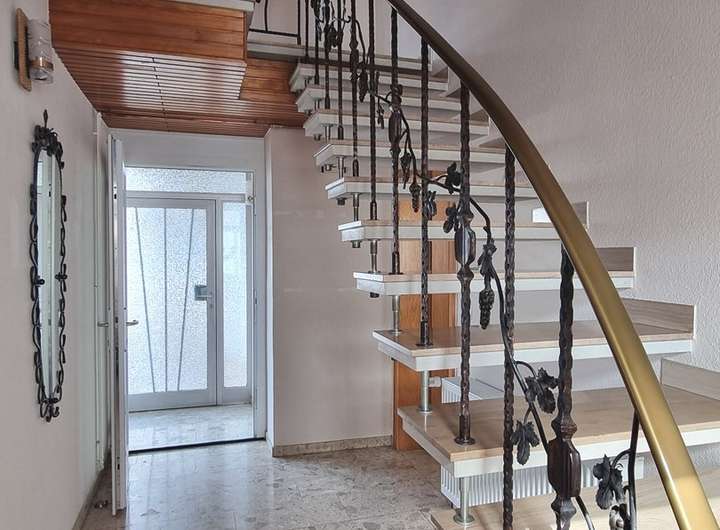 * Freitragende Treppe mit Marmorstufen, Schmiedeeisengeländer (Maßanfertigung, Handarbeit),