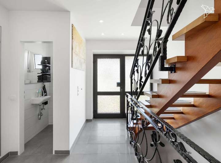 In ruhiger, familienfreundlicher Lage erwartet Sie dieses gepflegte Reiheneckhaus mit gehobener Ausstattung und durchdachtem Raumkonzept. Auf rund 124 m² Wohnfläche, verteilt auf drei Etagen, bietet die Immobilie insgesamt vier Zimmer, darunter drei Schlafzimmer – ideal für Paare oder Familien, die großzügiges und stilvolles Wohnen schätzen. Der lichtdurchflutete Wohnbereich überzeugt mit direktem Zugang zur sonnigen Terrasse und dem liebevoll angelegten Garten. Hier erwartet Sie eine grüne Oase mit Bewässerungssystem, elektrischem Brunnen und charmantem Grillplatz – perfekt für entspannte Stunden im Freien. Ein gepflegter Vorgarten unterstreicht den einladenden Charakter des Hauses. Die moderne Einbauküche ist bereits im Kaufpreis enthalten und lässt keine Wünsche offen. Ergänzt wird das Raumangebot durch ein stilvolles Tageslichtbad mit Dusche sowie ein separates Gäste-WC im Erdgeschoss. Hochwertige Ausstattungsdetails wie elektrische Rollläden im gesamten Erdgeschoss (ausgenommen Gäste-WC), doppelt verglaste Fenster und ein geschmiedetes Eisengeländer setzen elegante Akzente. Das Haus ist voll unterkellert und bietet mit einer Waschküche, einem Abstellraum und weiteren Nutzflächen viel Platz für Ordnung und Organisation. Eine überdachte Loggia sorgt für zusätzlichen Wohnkomfort, während eine Doppelgarage sowie zwei Außenstellplätze das großzügige Angebot abrunden. In den letzten Jahren wurde die Immobilie kontinuierlich modernisiert: Unter anderem wurden die Außenwände 2021 gedämmt, die Garage 2022 neu verkleidet und der Außenbereich inklusive Stellplätzen neu gepflastert. Auch Loggia, Geländer, Zaunanlage, Badezimmer und Innenausbau wurden mit viel Liebe zum Detail erneuert. Die massive Bauweise, die umfassende Dämmung sowie die gepflegten Böden und Sanitärbereiche schaffen ein Wohnambiente zum Wohlfühlen. Dieses Reiheneckhaus verbindet stilvolles Wohnen mit hochwertiger Ausstattung, einer durchdachten Raumaufteilung und einem idyllischen Außenbereich – ein perfektes Zuhause für alle, die Wert auf Qualität, Komfort und ein gepflegtes Umfeld legen.