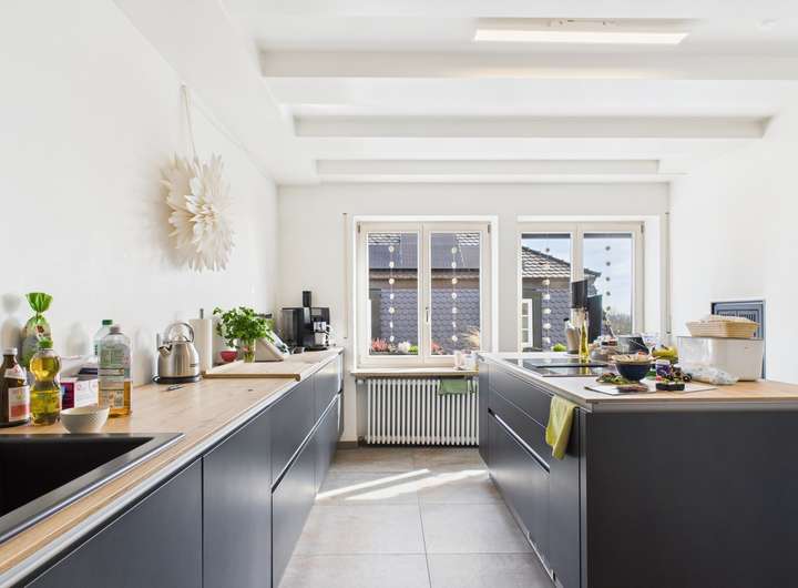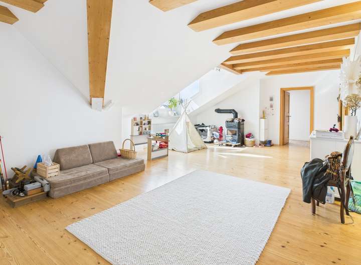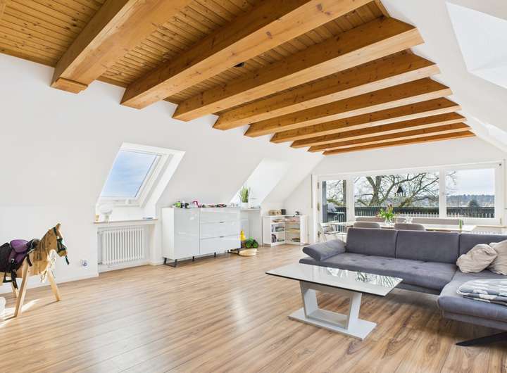 Das Herz der Wohnung ist der großzügige Wohnbereich, der durch offene Sichtbalken eine moderne, loftartige Note erhält. Von hier aus gelangen Sie auf den sonnigen Balkon mit herrlichem Weitblick.