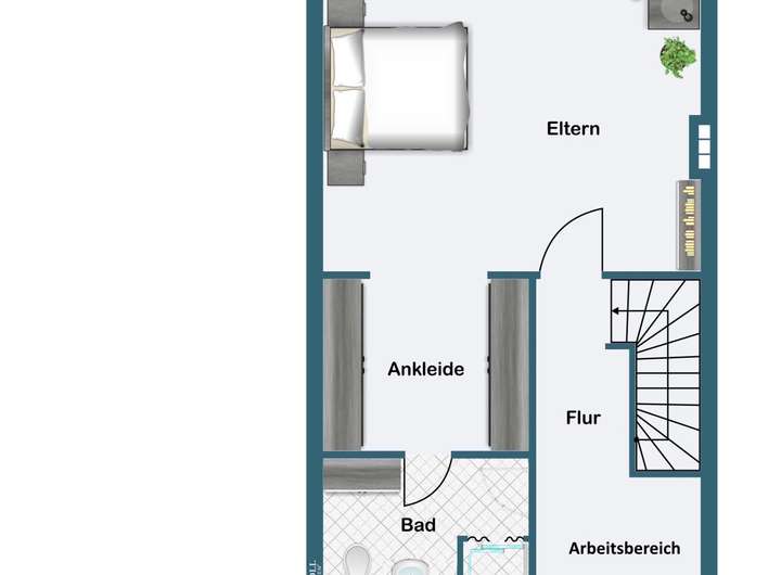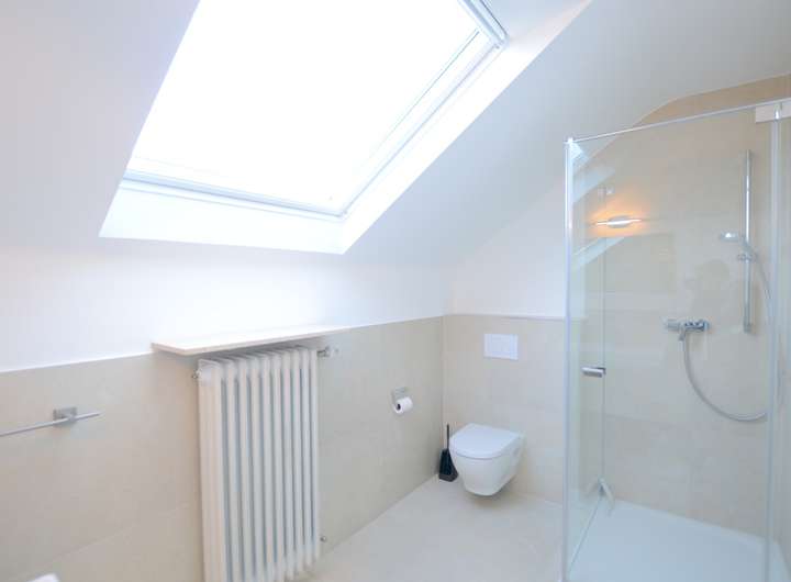 Das Dachgeschoss bietet sich als Rückzugsbereich für die Eltern an und verfügt über einen weiteren, sehr großzügigen Schlafraum, eine angrenzende Ankleide, ein Duschbad sowie einen separaten Arbeitsbereich. Die kleine Loggia lädt zum Sundowner ein.