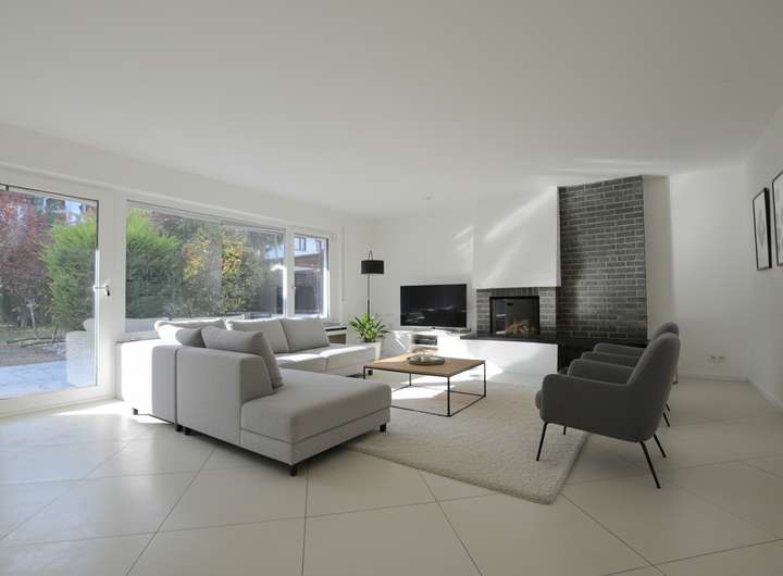 Das Erdgeschoss besticht durch einen großen, hellen und offenen Wohn-/ Essbereich. Der offene Kamin sorgt im Winter für eine gemütliche Atmosphäre. Ein großes Fensterelement gewährt Zugang zur vorgelagerten Sonnenterrasse.