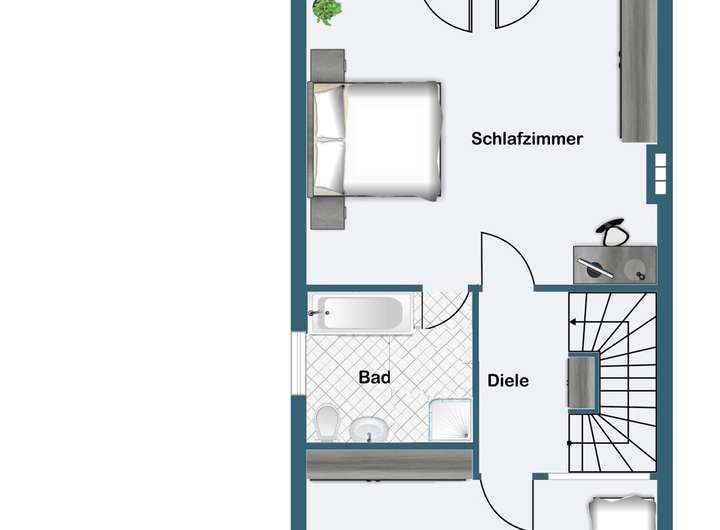 Im Obergeschoss befinden sich zwei große, helle Schlafzimmer sowie das Hauptbad mit Badewanne und Dusche und ein Balkon mit Blick in den Garten. Für die größere Familie besteht die Möglichkeit, das zum Garten gelegene, 30 m² große Zimmer, mittig zu teilen.