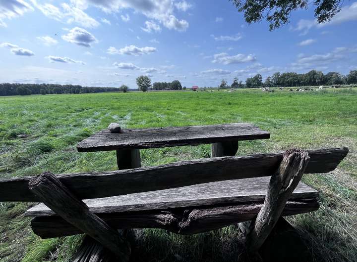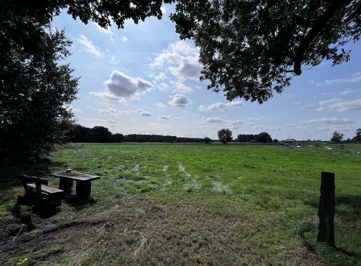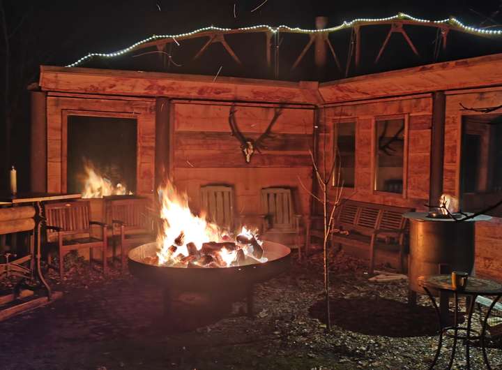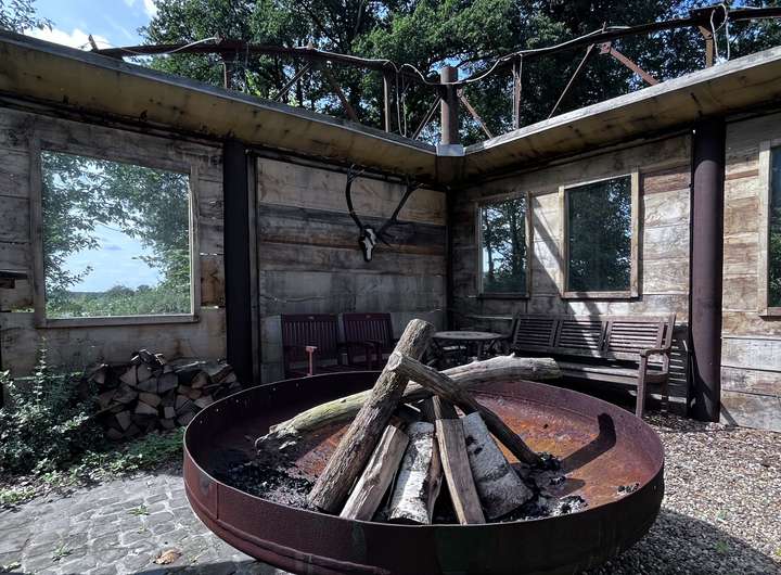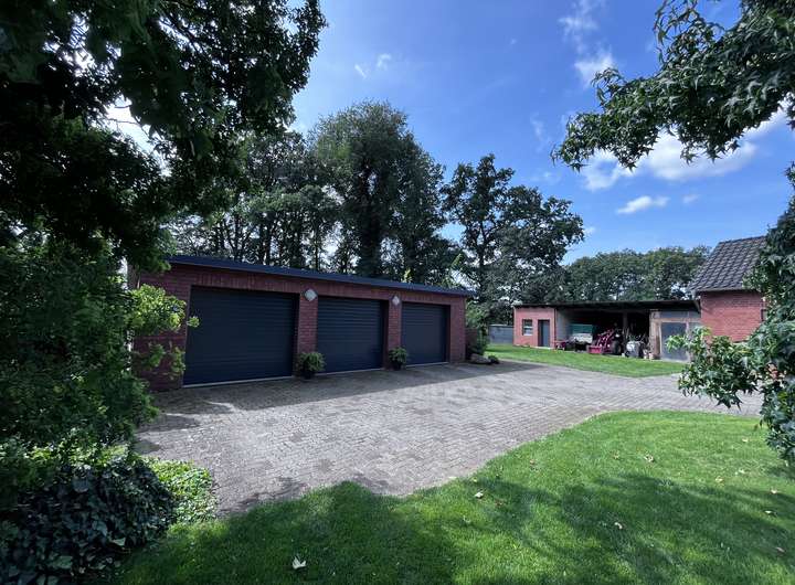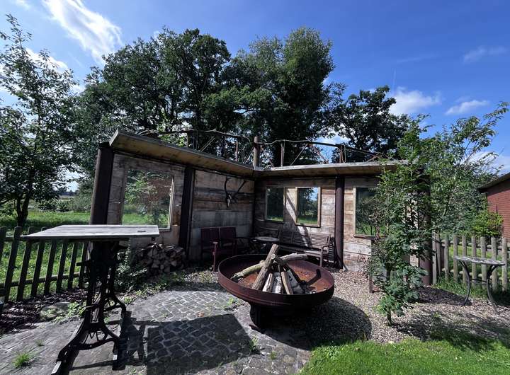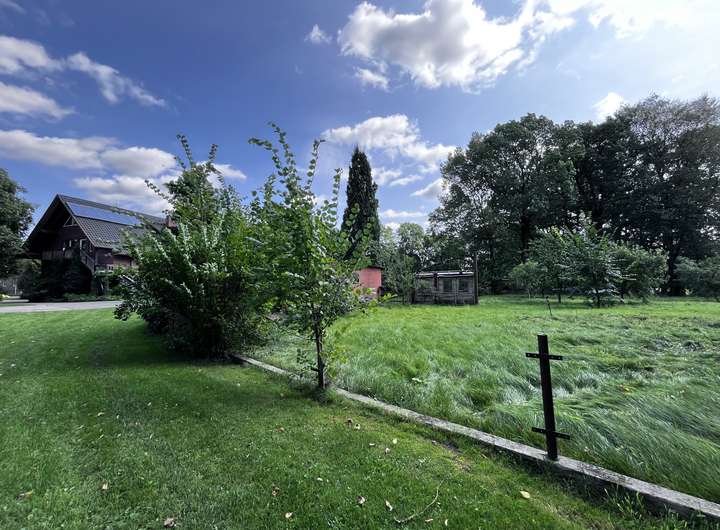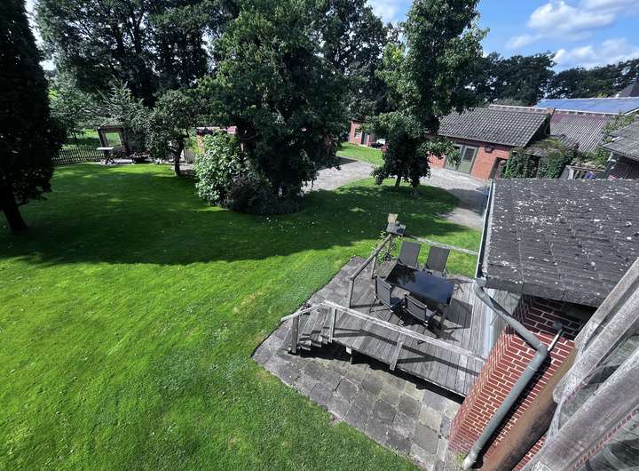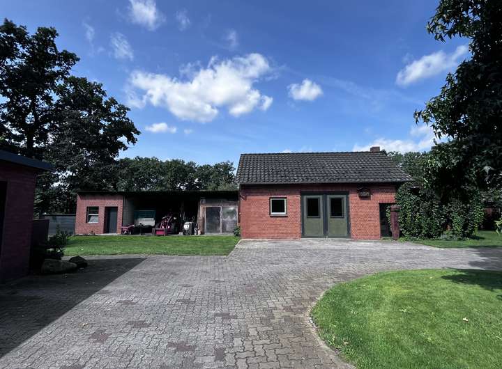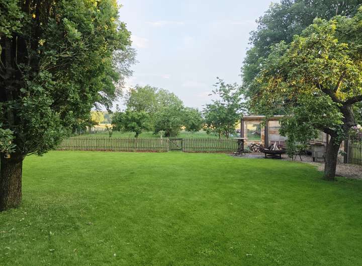 Zum Garten gehören neben den Staudenbeeten und dem Hochbeet noch die neue Sitzecke um die Feuerschale, eine Streuobstwiese, ein kleines Wäldchen mit Schafstall und natürlich das Grünland fast soweit das Auge reicht. Im ehemaligen Stall ist ein tolles Kaminzimmer entstanden. In weiteren Nebengebäuden befinden sich eine voll ausgestattete Werkstatt mit Hebebühne und Mechanikergrube sowie eine Lackierkabine.