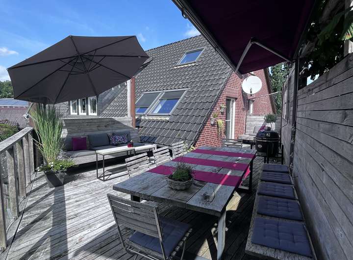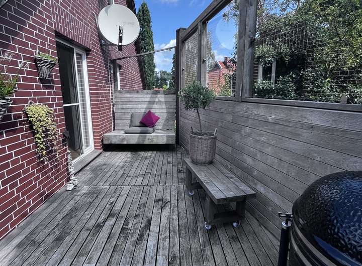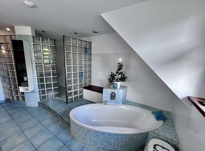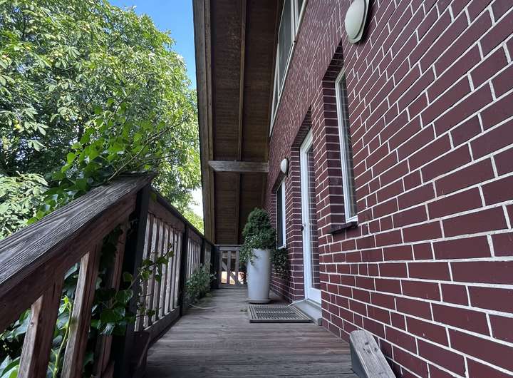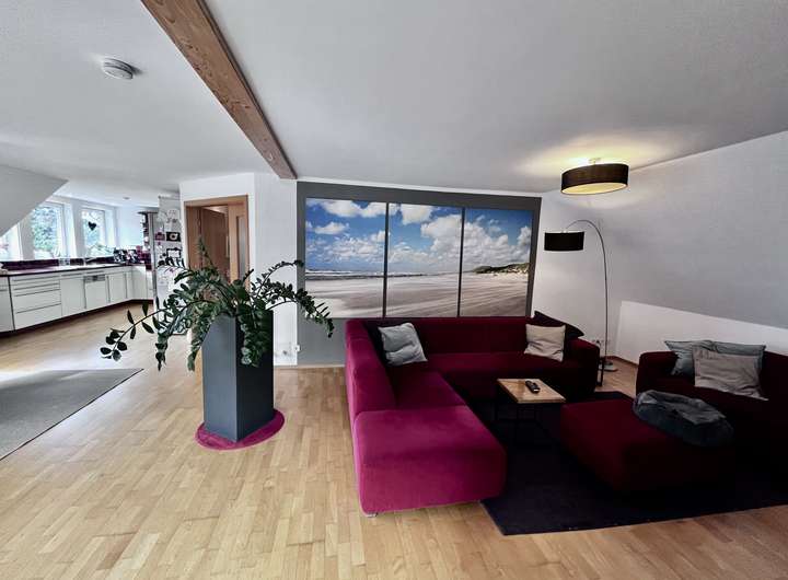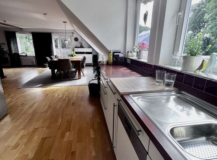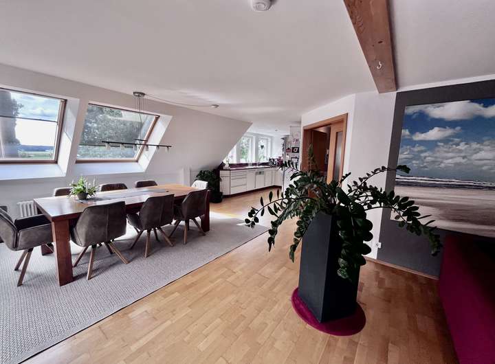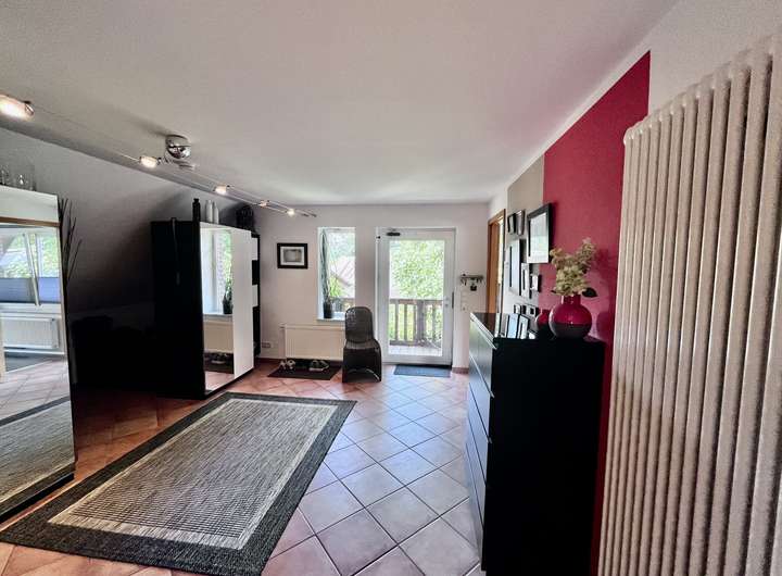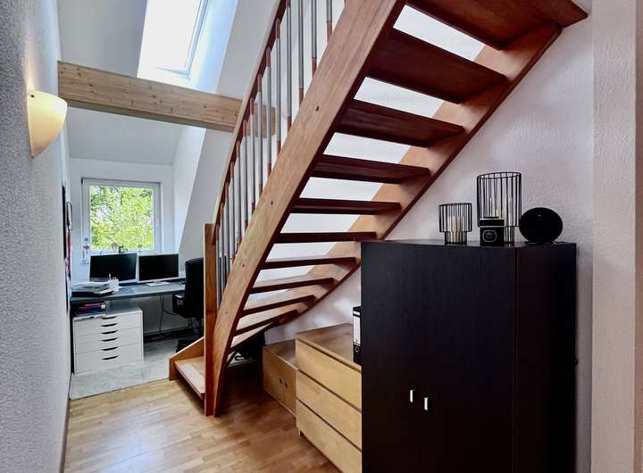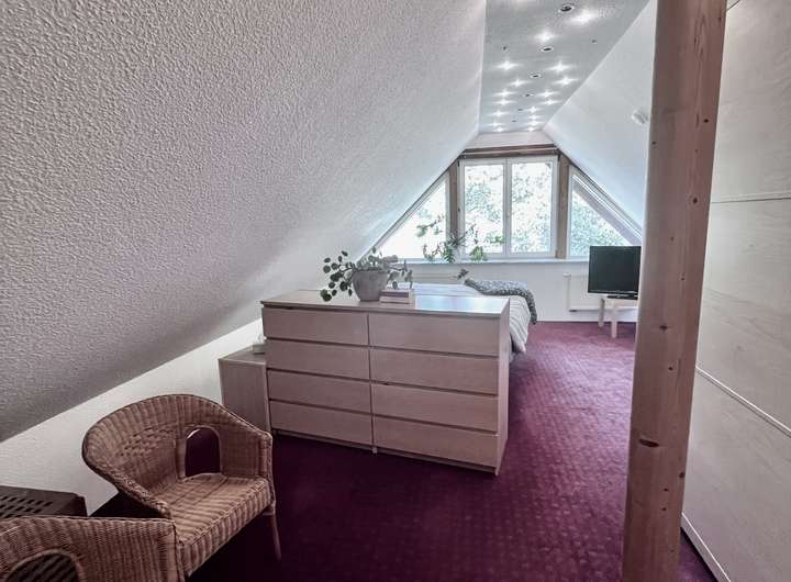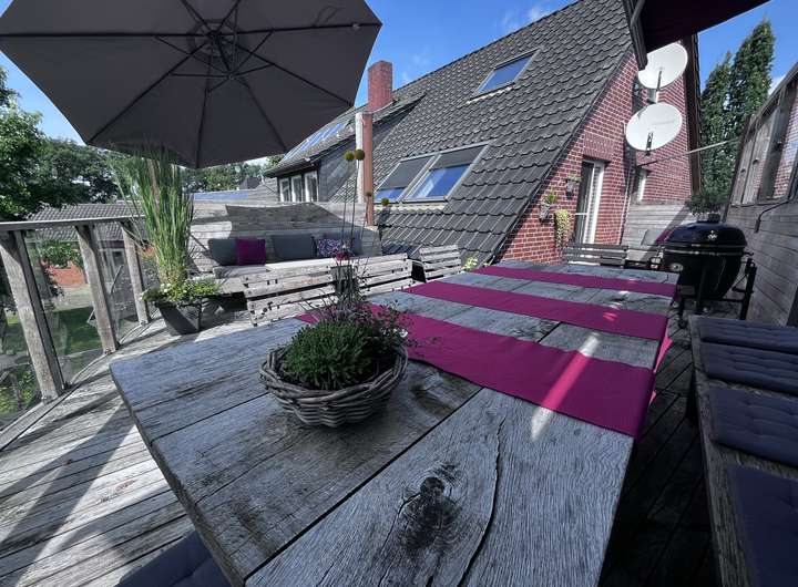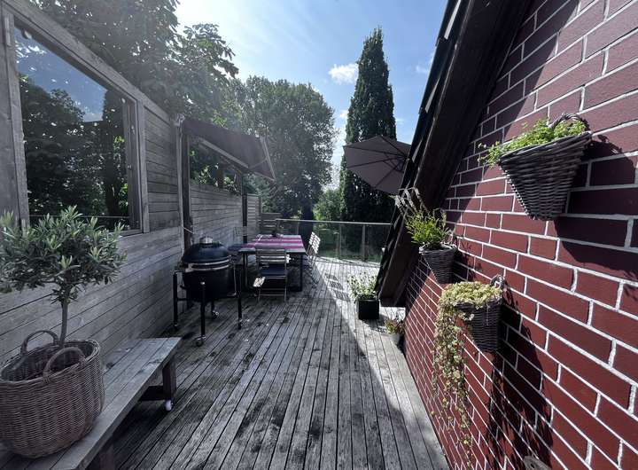 Vor allem im Ober- und Dachgeschoss hat sich etwas getan: Hier wurde 2002 eine komplett neue Wohneinheit, mit Zugang über eine komfortable Außentreppe (Zugang innerhalb des Hauses weiterhin möglich), geschaffen. Hier stehen der jungen Familie auf ca. 207,01m² (Terrasse anteilig berechnet) und über 2 Etagen neben der großen Diele (Büro?) und den beiden Badezimmern 3 große Schlafräume zur Verfügung und der imposant große, offene Küchen/Ess- und Wohnzimmerbereich.