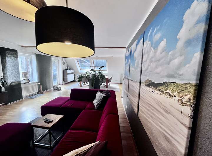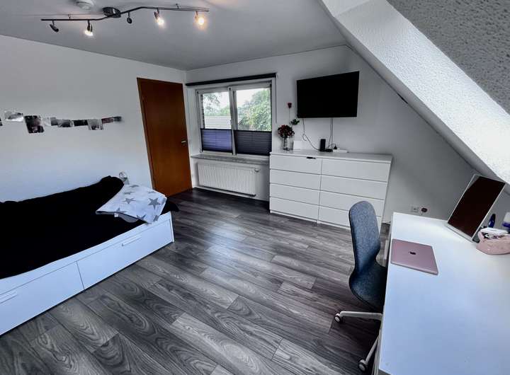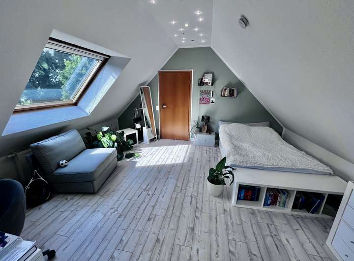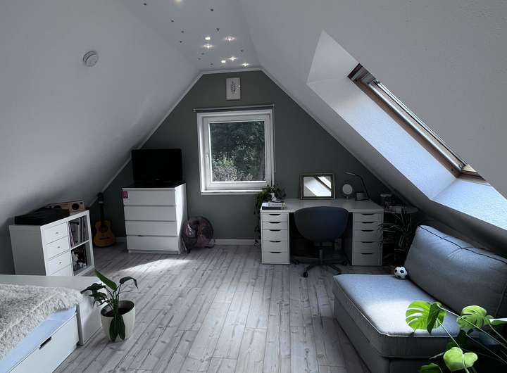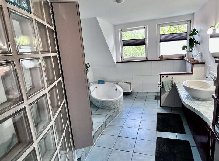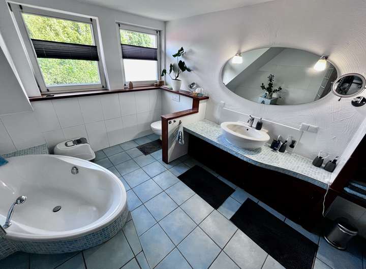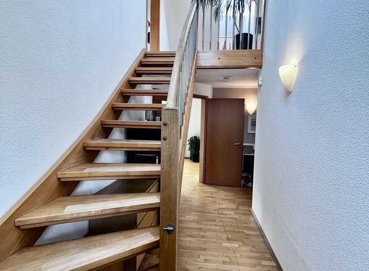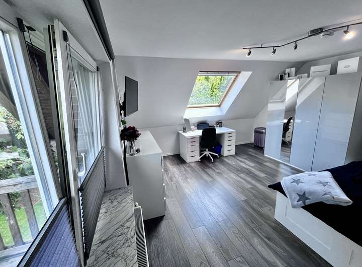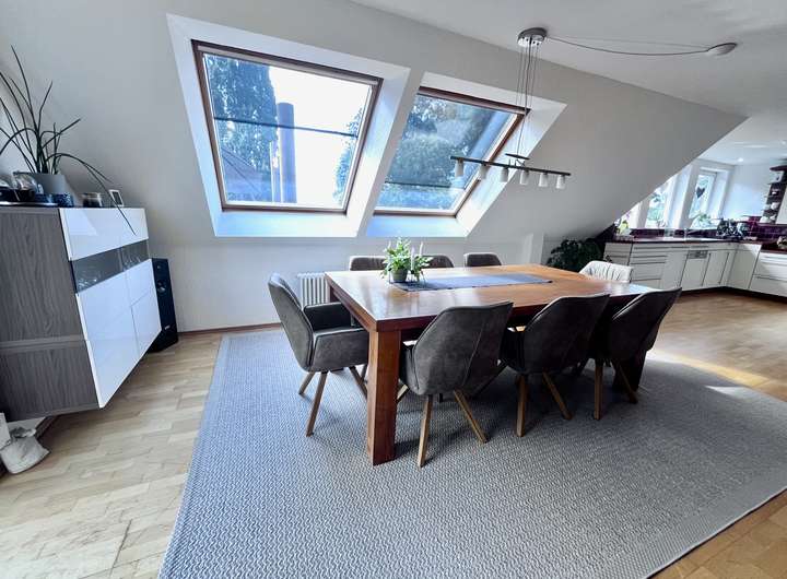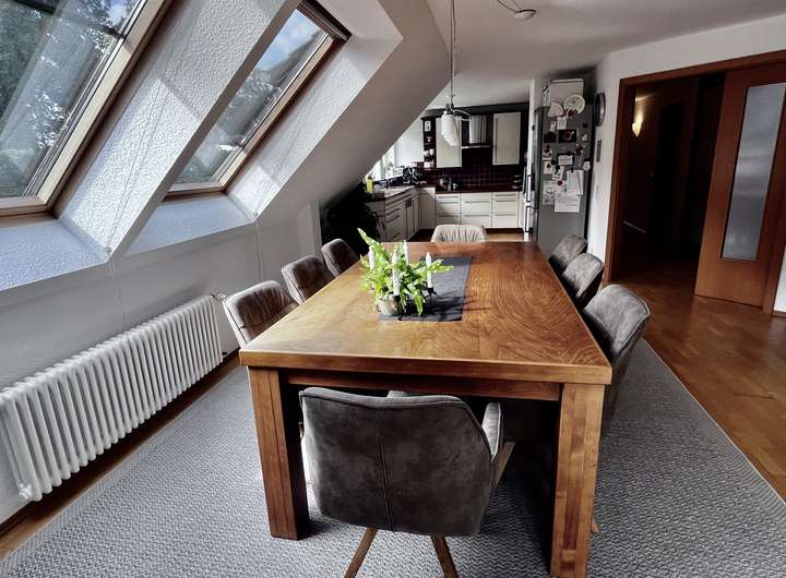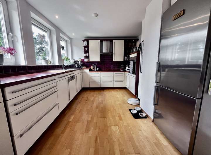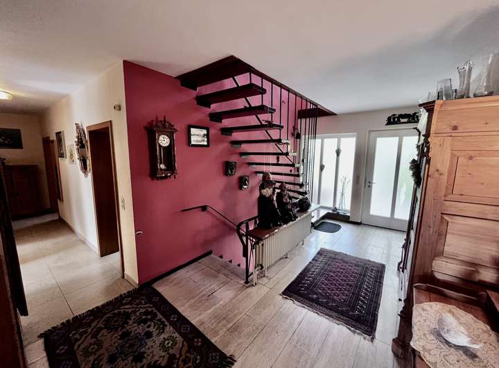 Vor allem im Ober- und Dachgeschoss hat sich etwas getan: Hier wurde 2002 eine komplett neue Wohneinheit, mit Zugang über eine komfortable Außentreppe (Zugang innerhalb des Hauses weiterhin möglich), geschaffen. Hier stehen der jungen Familie auf ca. 207,01m² (Terrasse anteilig berechnet) und über 2 Etagen neben der großen Diele (Büro?) und den beiden Badezimmern 3 große Schlafräume zur Verfügung und der imposant große, offene Küchen/Ess- und Wohnzimmerbereich.