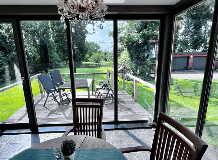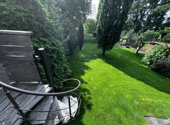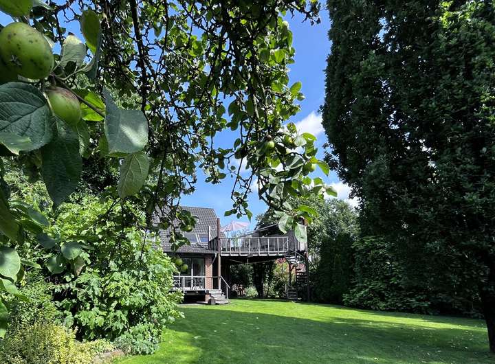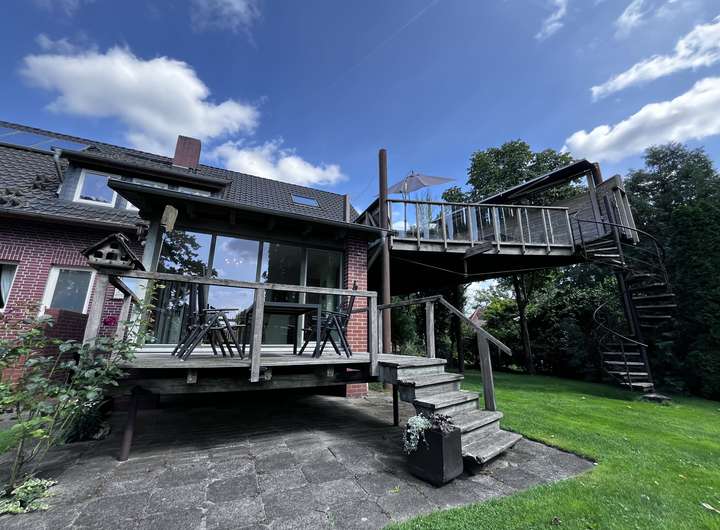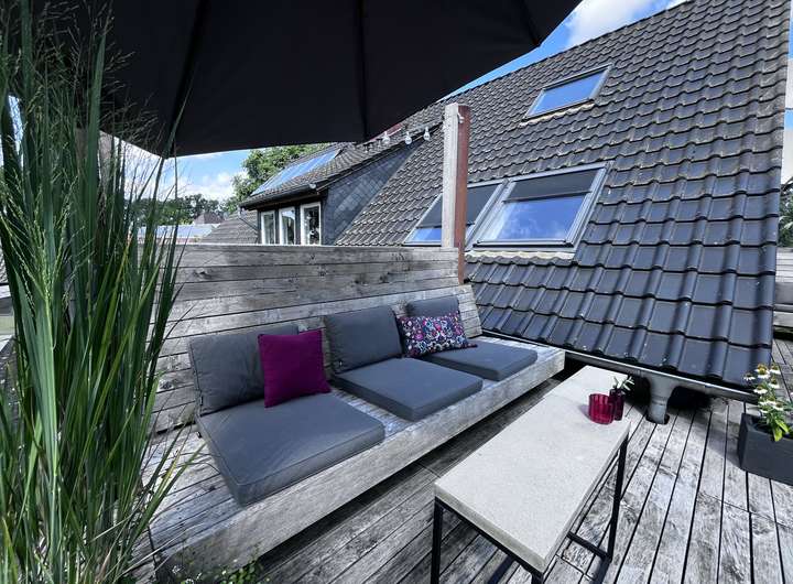 Und von hier geht es quasi in die Verlängerung, denn das rund 40m² Terrassendeck mit dem tollen Ausblick über den Garten und in die Ferne schließt sich an. Den Wolken ganz nah können hier auf den Maß gefertigten Eichenmöbeln schöne Sommerabende verbracht werden. Und für den kurzen Weg in den Garten gibt es eine Wendeltreppe am Ende des Sonnendecks.