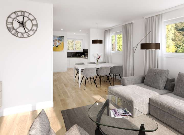Verteilt auf mehrere Ebenen verfügt das Haus im gesamten über vier großzügige Schlafzimmer, zwei Bäder, ein Gäste-WC, ein lichtdurchflutetes Wohn-Esszimmer mit offener Küche im Erdgeschoss.