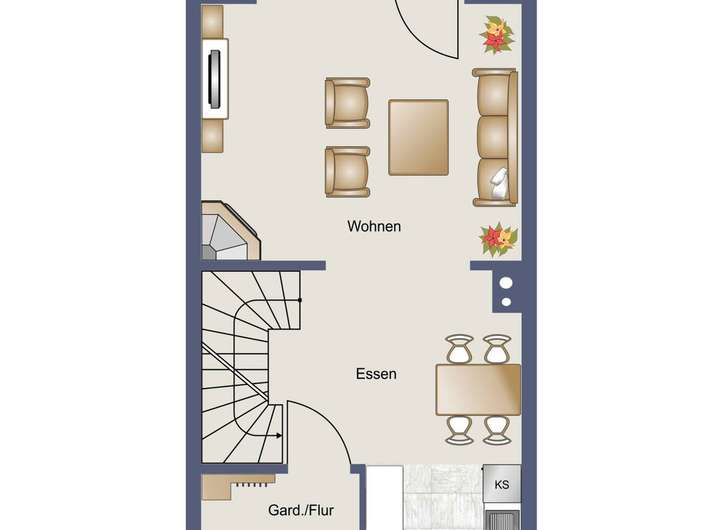 Beim Betreten des Hauses empfängt ein kleiner Vorraum mit Gäste-WC und praktischer Garderobe. Von hier aus betritt man den eigentlichen Wohnraum, den Essbereich, der fließend in die Küche übergeht und ein gemütliches Wohnzimmer mit Blick und Zugang zu Terrasse und Garten. Der Garten macht einen deutlich größeren Eindruck als die Grundstücksmaße von 200qm es vermuten lassen und grenzt zudem direkt an einen lauschigen, grün eingewachsenen Spielplatz.