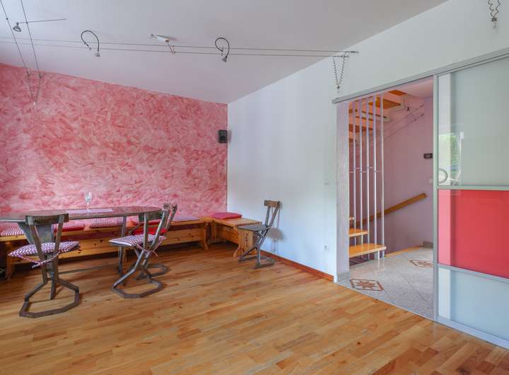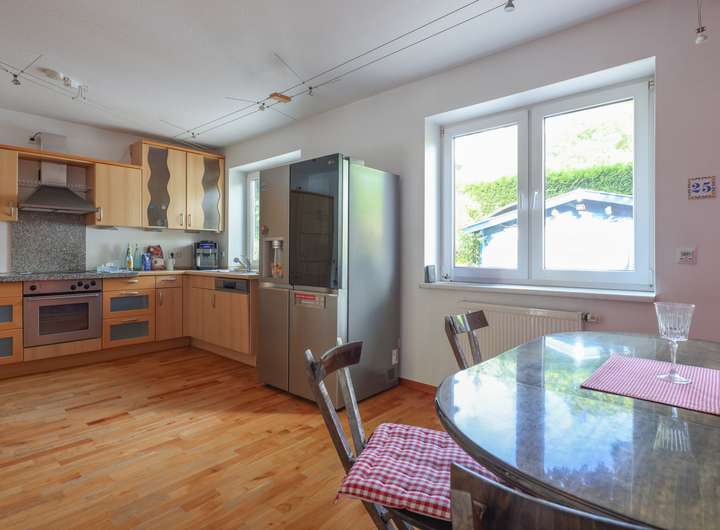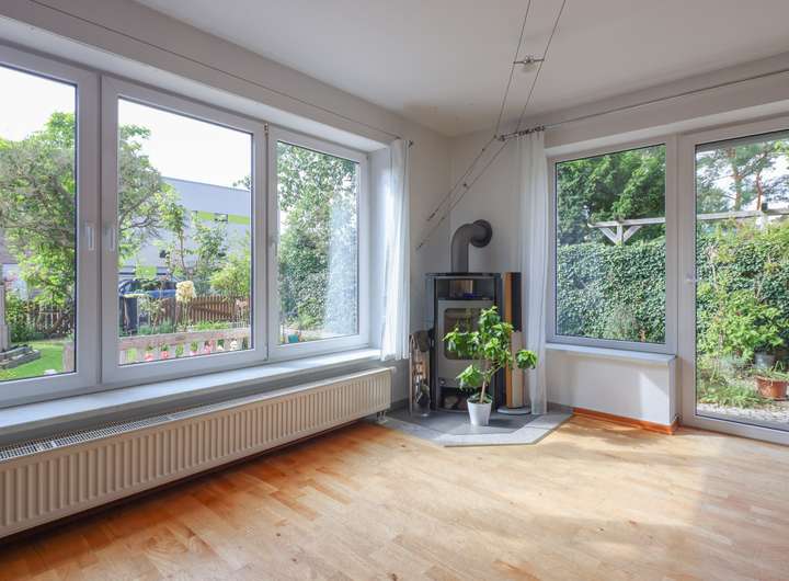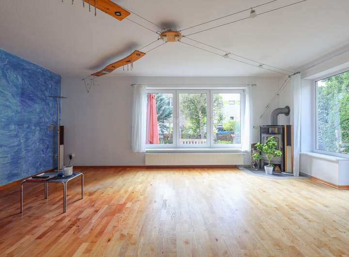 EG - großes Wohnzimmer (ca. 30 m²) mit Süd-West-Ausrichtung und Zugang zum Garten bzw. Terrasse, Kaminofen; Küche mit Einbauküche sowie ausreichend Platz für einen großen Essbereich; Gäste-WC.