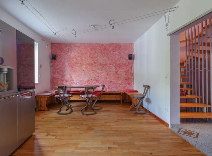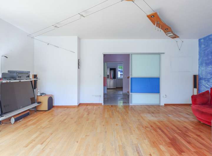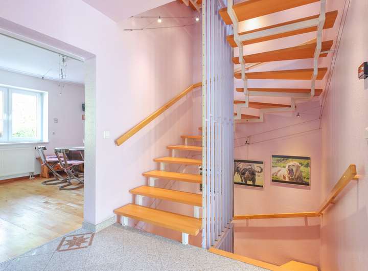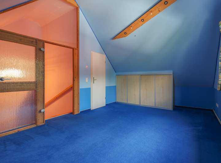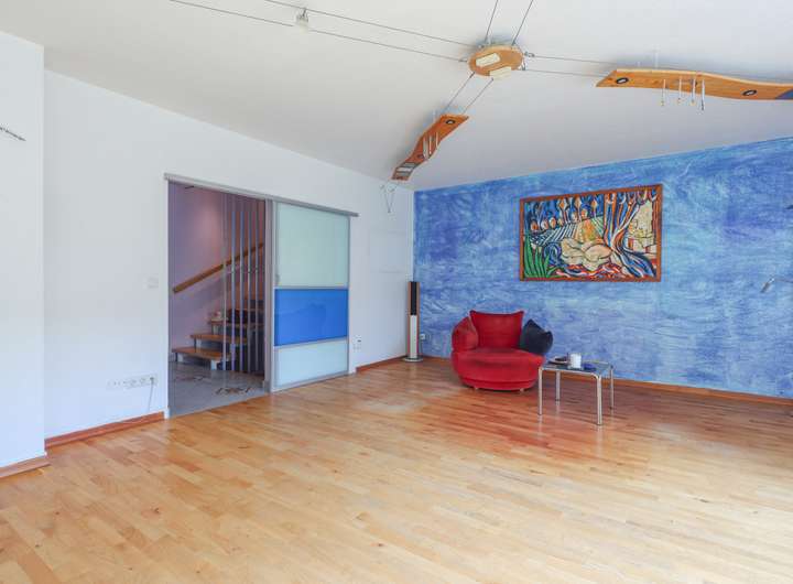 Wohnzimmer und Küche sowie der Wohnraum im Untergeschoss sind mit Parkett versehen, der Eingangsbereich ist gefliest, die Wohnräume im Ober- und Dachgeschoss sind mit Teppichboden belegt. Die Raumhöhen betragen 2,5 Meter, im Untergeschoss 2,3 Meter.