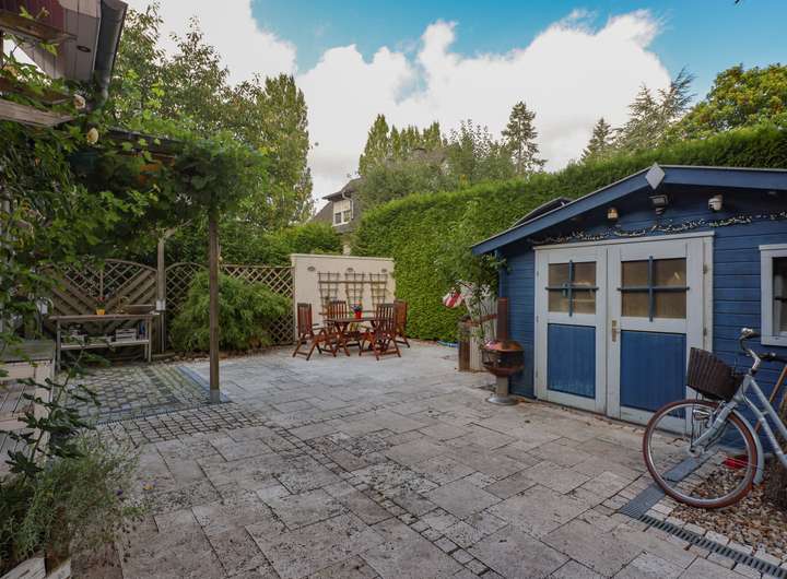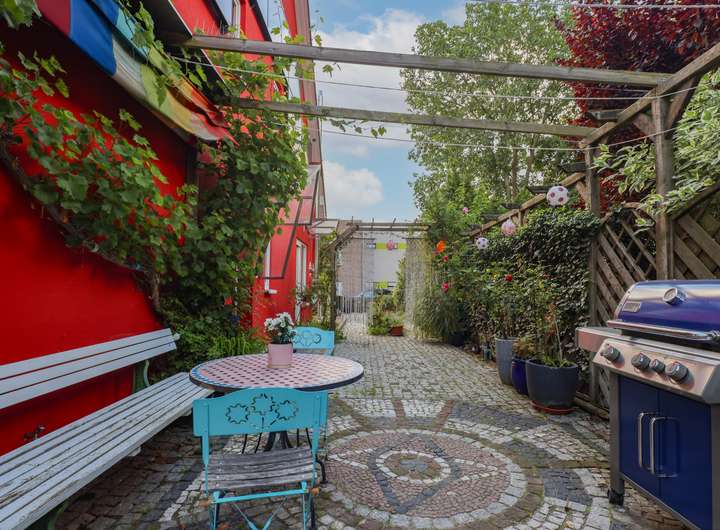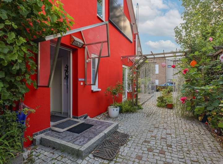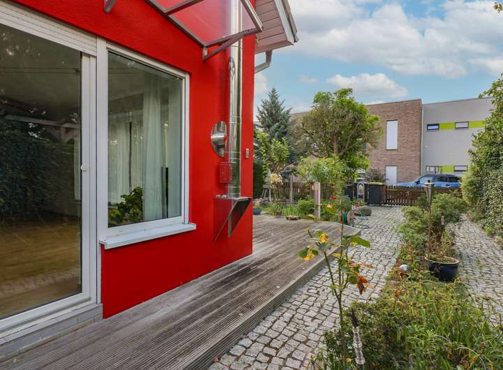 Die Doppelhaushälfte ist Teil einer Wohnungseigentümergemeinschaft mit der angrenzenden Haushälfte. Die Grundstücksfläche zur alleinigen Sondernutzung beträgt ca. 320 Quadratmeter groß. Der nach Südwesten ausgerichtete Grundstückteil ist mit einer Terrasse versehen und gärtnerisch angelegt, hier befindet sich auch die ca. 5000 Liter fassende Zisterne zur Sammlung von Oberflächenwasser zur Gartenbewässerung. Der rückwärtige Grundstücksbereich ist gepflastert und kann somit vielseitig genutzt werden. Das dort befindliche Gartenhaus bietet Unterstellmöglichkeiten für Fahrräder und Gartengeräte.